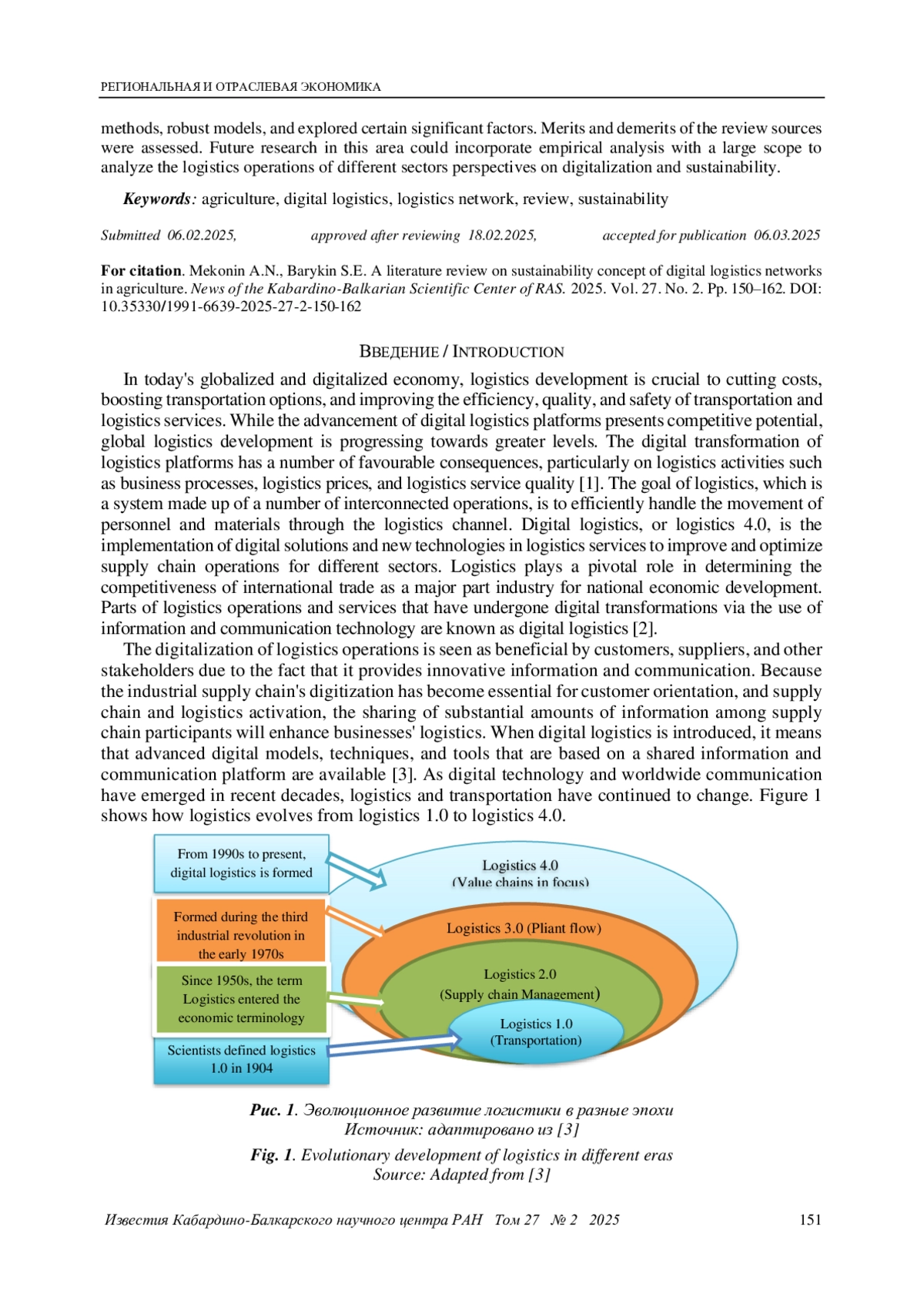 Устойчивость цифровых логистических сетей – это сложный вопрос, который включает в себя экономическую эффективность, социальную ответственность и сохранение окружающей среды. В связи с этим растет спрос на решение логистических операций с использованием концепций цифровизации и устойчивого развития. Несмотря на быстрое развитие логистической отрасли, все еще существует пробел в исследованиях, касающихся трансформации логистики в устойчивую цифровую логистику. Таким образом, эта статья направлена на обзор эмпирических и методологических рамок текущего состояния исследований цифровой логистической сети и устойчивости с особым упором, помимо прочего, на сельскохозяйственную логистику. Для обзора и всестороннего анализа широкого круга задач были выбраны авторитетные академические источники. В результате обзора были выявлены некоторые инновационные методы, надежные модели и изучен ряд важных факторов. Оценены достоинства и недостатки источников обзора. Будущие исследования в этой области могут включать эмпирический анализ с широким охватом для анализа логистических операций различных секторов с точки зрения цифровизации и устойчивости.