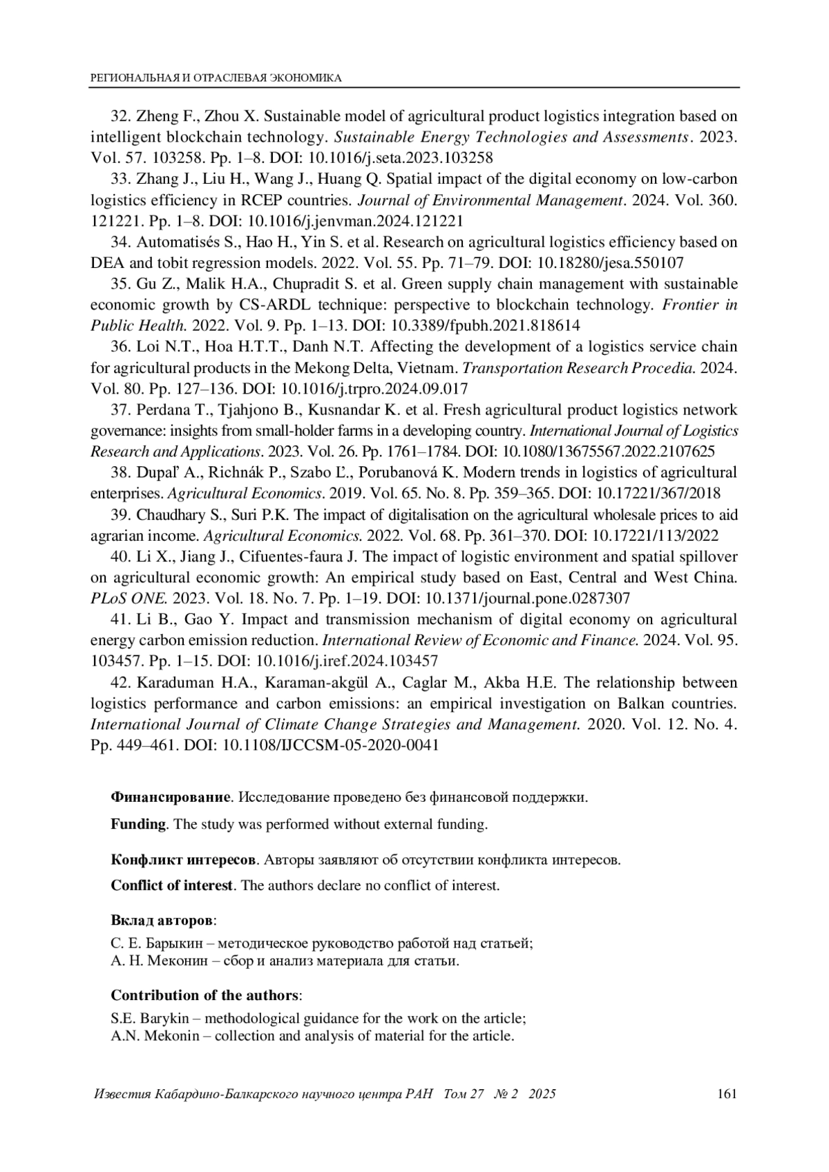 27. Chunfang Y., Xing J., Changming C. et al. Digital economy empowers sustainable agriculture: Implications for farmers’ adoption of ecological agricultural technologies. Ecological indicators. 2024. Vol. 159. 111723. Pp. 1-15. DOI: 10.1016/j.ecolind.2024.111723 EDN: HVOKNY