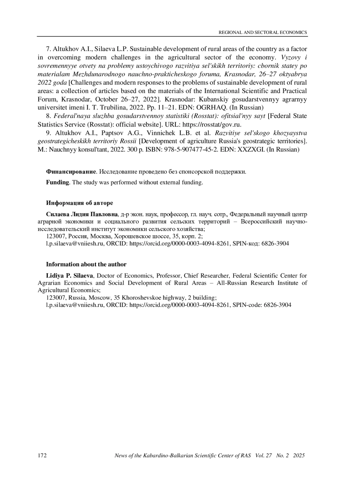 7. Алтухов А. И., Силаева Л. П. Устойчивое развитие сельских территорий страны как фактор преодоления современных вызовов в аграрной сфере экономики // Вызовы и современные ответы на проблемы устойчивого развития сельских территорий: cборник статей по материалам Международного научно-практического форума, Краснодар, 26-27 октября 2022 года. Краснодар: Кубанский государственный аграрный университет имени И. Т. Трубилина, 2022. С. 11-21. EDN: OGRHAQ