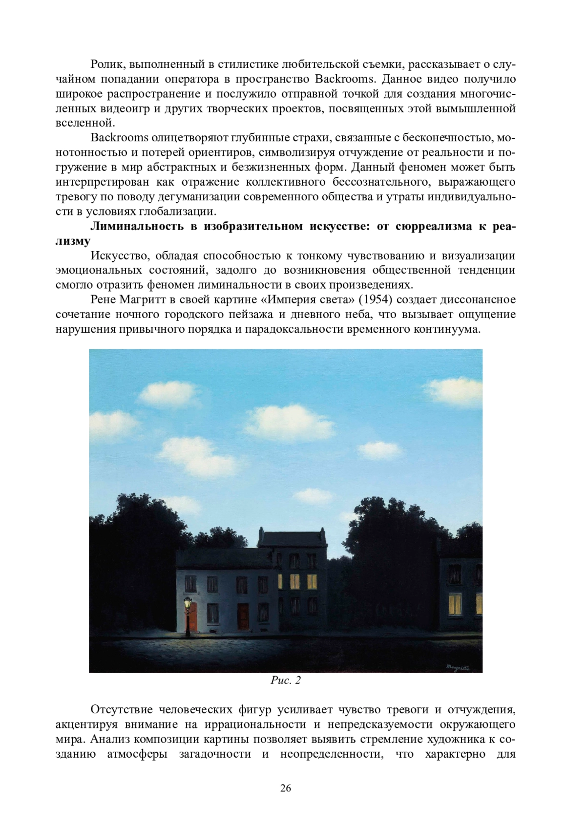 Статья исследует феномен лиминальных пространств как зон переходных состояний, вызывающих амбивалентные эмоции тревоги и меланхолии. Через междисциплинарный анализ (философия, культурология, психология) раскрывается их роль в современной культуре, включая примеры из искусства, цифровой среды (Backrooms) и психологических концепций (кенопсия, розовая ретроспекция). Работа подчеркивает связь лиминальности с трансформацией идентичности и отражением коллективных страхов в условиях глобальных перемен.