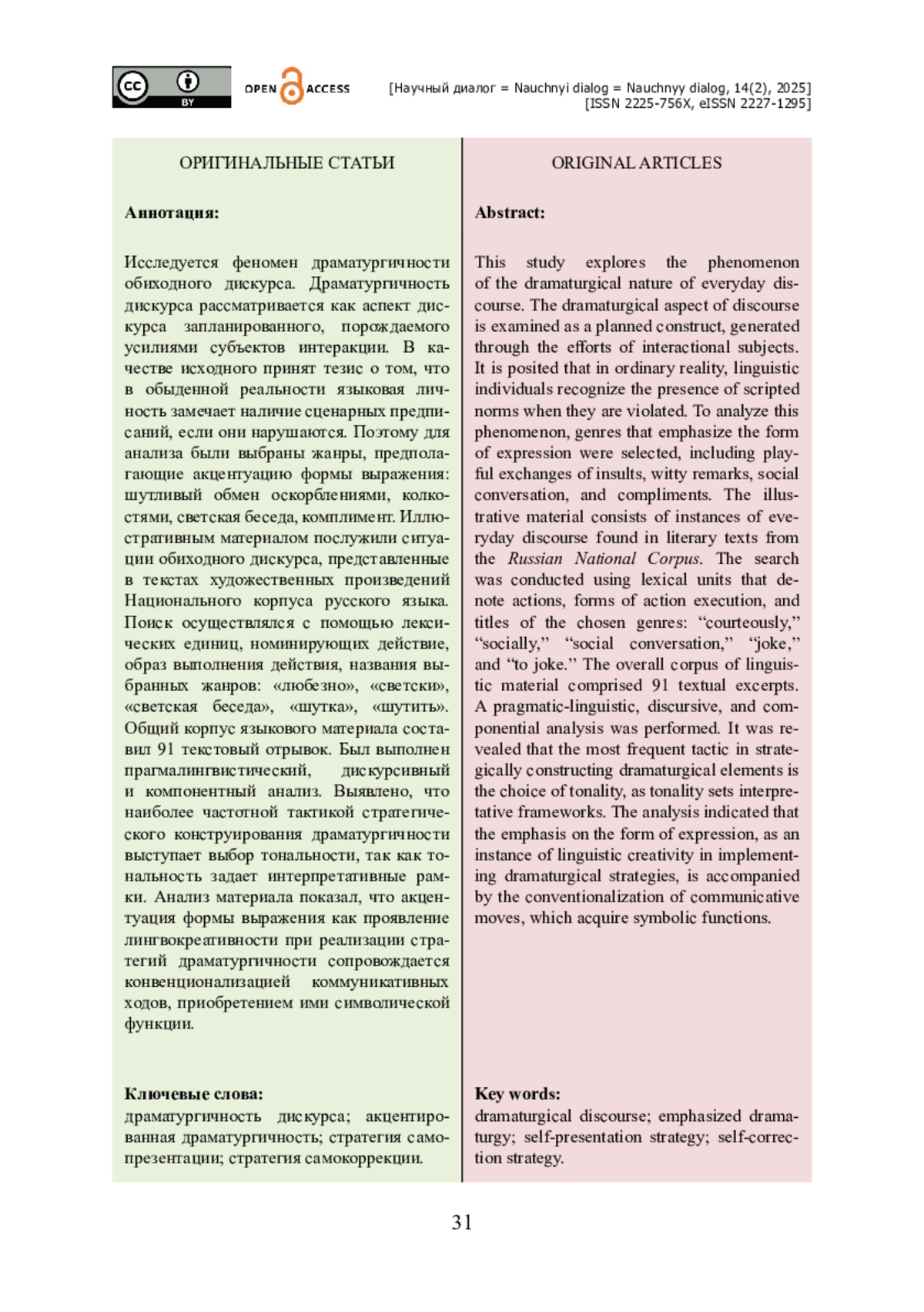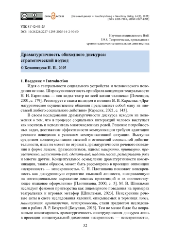 Исследуется феномен драматургичности обиходного дискурса. Драматургичность дискурса рассматривается как аспект дискурса запланированного, порождаемого усилиями субъектов интеракции. В качестве исходного принят тезис о том, что в обыденной реальности языковая личность замечает наличие сценарных предписаний, если они нарушаются. Поэтому для анализа были выбраны жанры, предполагающие акцентуацию формы выражения: шутливый обмен оскорблениями, колкостями, светская беседа, комплимент. Иллюстративным материалом послужили ситуации обиходного дискурса, представленные в текстах художественных произведений Национального корпуса русского языка. Поиск осуществлялся с помощью лексических единиц, номинирующих действие, образ выполнения действия, названия выбранных жанров: «любезно», «светски», «светская беседа», «шутка», «шутить». Общий корпус языкового материала составил 91 текстовый отрывок. Был выполнен прагмалингвистический, дискурсивный и компонентный анализ. Выявлено, что наиболее частотной тактикой стратегического конструирования драматургичности выступает выбор тональности, так как тональность задает интерпретативные рамки. Анализ материала показал, что акцентуация формы выражения как проявление лингвокреативности при реализации стратегий драматургичности сопровождается конвенционализацией коммуникативных ходов, приобретением ими символической функции.
