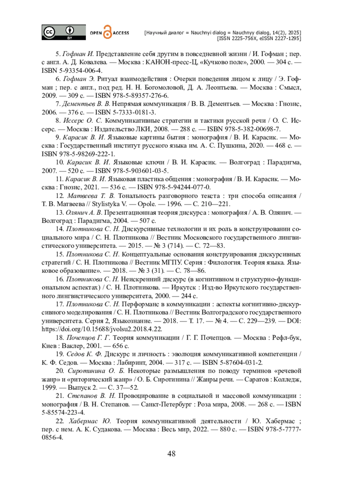 14. Плотникова С. Н. Дискурсивные технологии и их роль в конструировании социального мира / С. Н. Плотникова // Вестник Московского государственного лингвистического университета. - 2015. - № 3 (714). - С. 72-83.