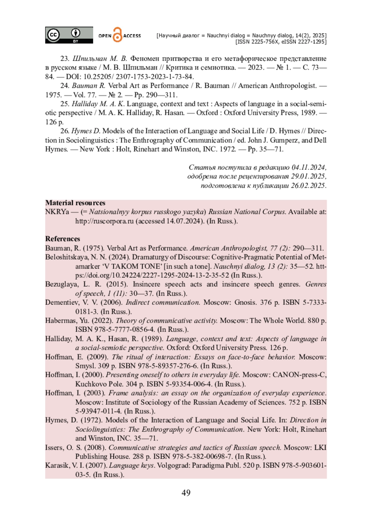 23. Шпильман М. В. Феномен притворства и его метафорическое представление в русском языке / М. В. Шпильман // Критика и семиотика. - 2023. - № 1. - С. 73- 84. - https://doi.org/10.25205/2307-1753-2023-1-73-84.