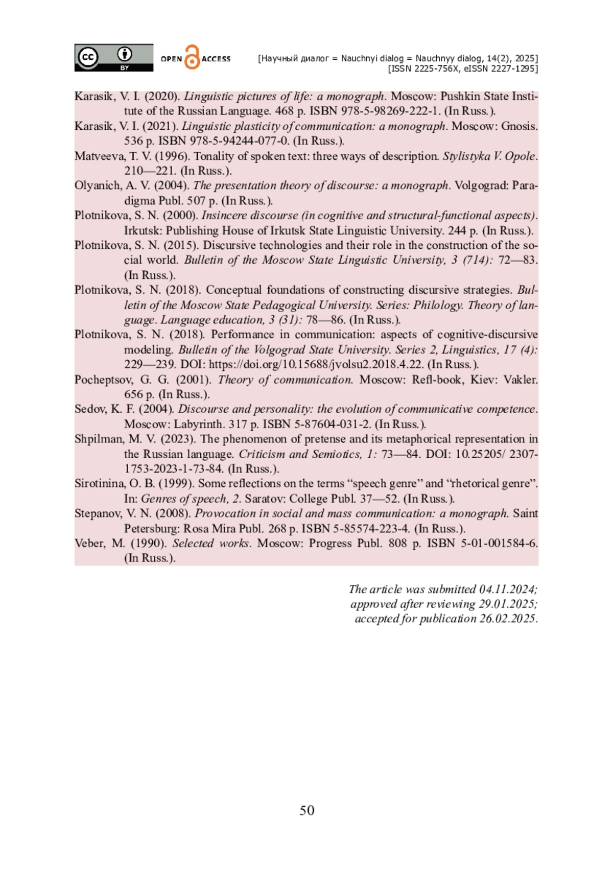 1. Безуглая Л. Р. Неискренние речевые акты и неискренние речевые жанры / Л. Р. Безуглая // Жанры речи. - 2015. - № 1 (11). - С. 30-37.