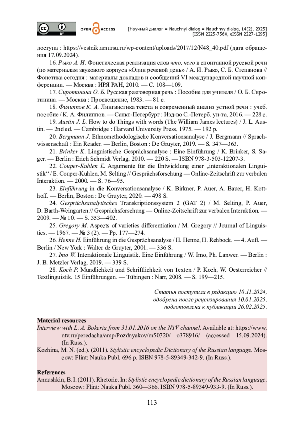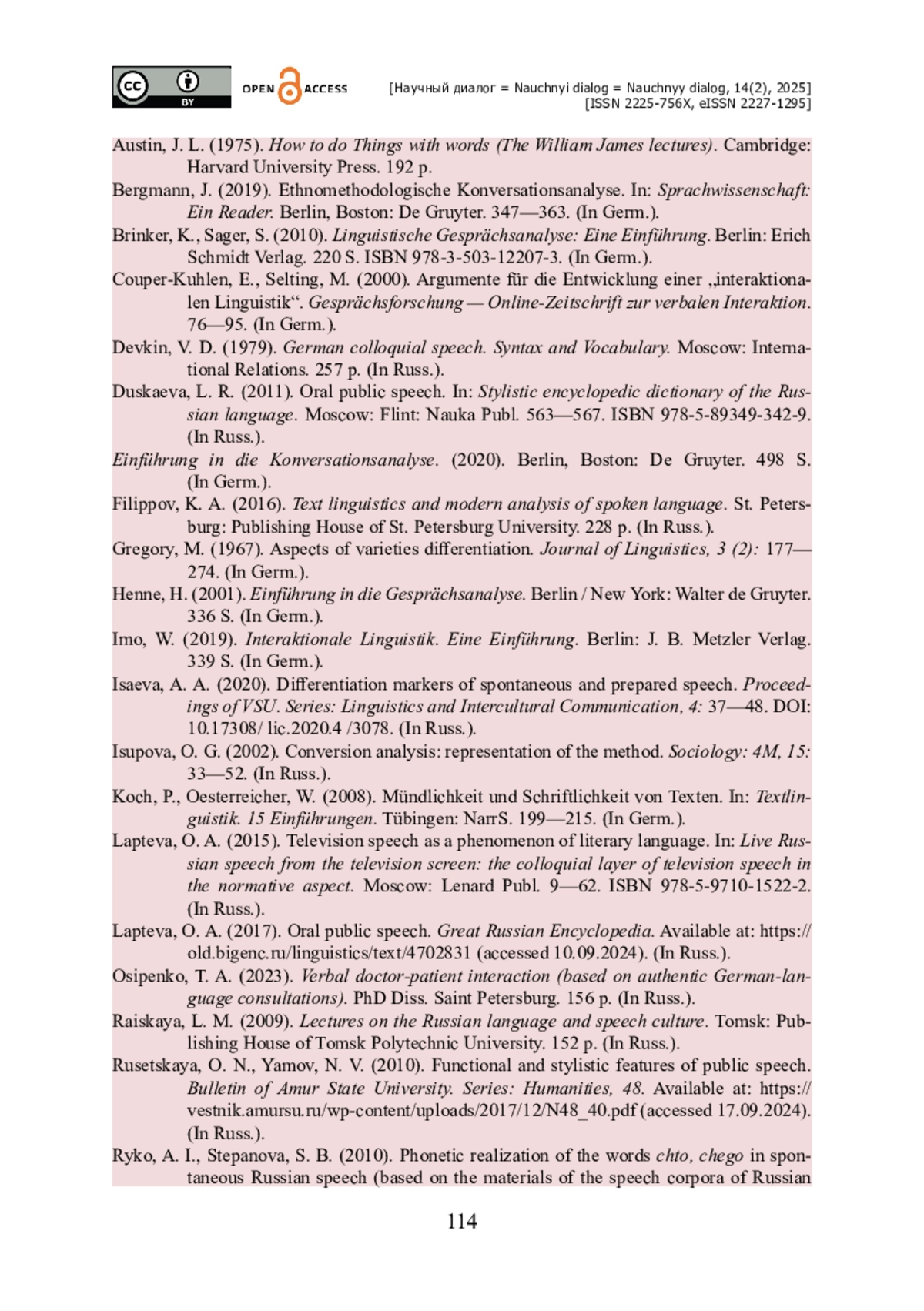 22. Couper-Kuhlen E. Argumente für die Entwicklung einer „interaktionalen Linguistik“ / E. Couper-Kuhlen, M. Selting // Gesprächsforschung - Online-Zeitschrift zur verbalen Interaktion. - 2000. - S. 76-95.