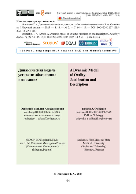 Статья посвящена описанию структуры и принципов функционирования динамической модели устности. В рамках модели звучащая речь расценивается как динамический процесс. Модель позволяет фиксировать структурные, языковые, просодические и другие изменения, отвечающие за уникальность и индивидуальность естественного коммуникативного процесса или устно проявленного текста, подготовленного заранее. Актуальность исследования обусловлена повышением интереса к анализу звучащей речи. Новизна работы заключается в возможности получения схематического изображения процесса коммуникации или устно проявленного текста с помощью выявления уникальных (проявленных только в этом звуковом оформлении) характеристик, отражающих моменты ослабления / усиления динамики. Описываемая модель противопоставляется статическим классификациям устности, используемым при выявлении общих стилеобразующих, языковых, коммуникативных и других черт. Цель исследования заключается в представлении динамической модели устности: описании ее структуры, принципов работы и области применения. Модель представляет собой прямоугольную систему координат с осью спонтанности и осью официальности. Принцип работы модели основан на выявлении динамики, создаваемой за счет вариативности используемых вербальных средств и изменения коммуникативной обстановки. Практическое применение модели видится в рамках анализа звучащей речи при сопоставительных исследованиях.