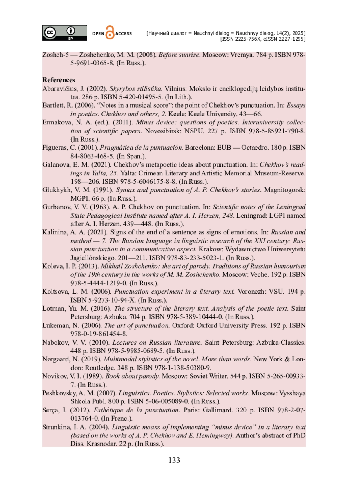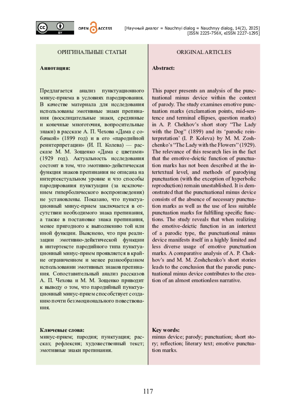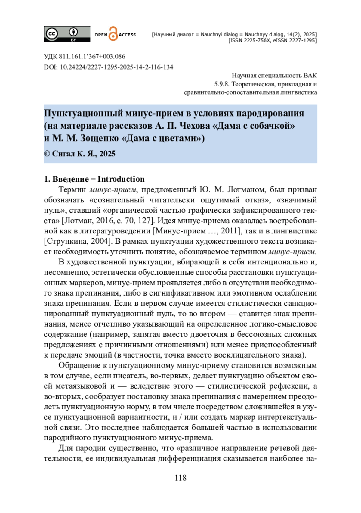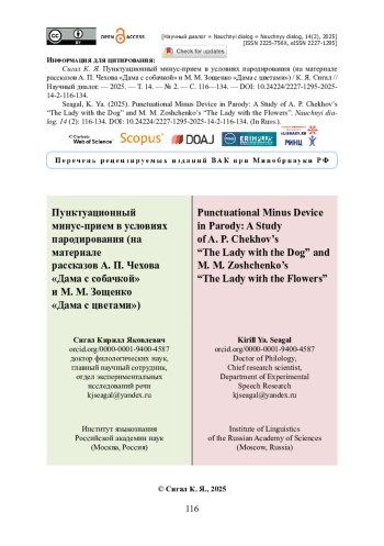 СИГАЛ К. Я. ПУНКТУАЦИОННЫЙ МИНУС-ПРИЕМ В УСЛОВИЯХ ПАРОДИРОВАНИЯ (НА МАТЕРИАЛЕ РАССКАЗОВ А. П. ЧЕХОВА «ДАМА С СОБАЧКОЙ» И М. М. ЗОЩЕНКО «ДАМА С ЦВЕТАМИ») // НАУЧНЫЙ ДИАЛОГ. 2025. ТОМ 14, № 2