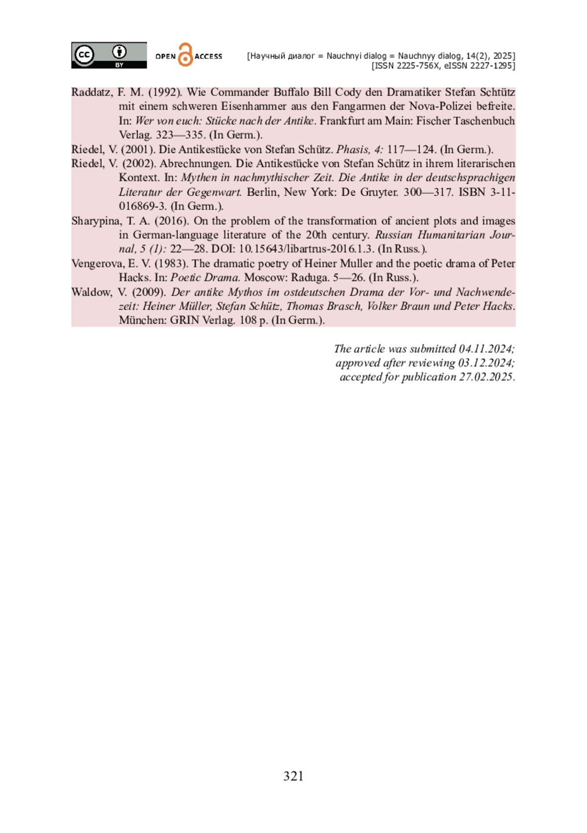 8. Шарыпина Т. А. К проблеме трансформации античных сюжетов и образов в немецкоязычной литературе XX века / Т. А. Шарыпина // Российский гуманитарный журнал. - 2016. - Т. 5. - № 1. - С. 22-28. - https://doi.org/10.15643/libartrus-2016.1.3.
