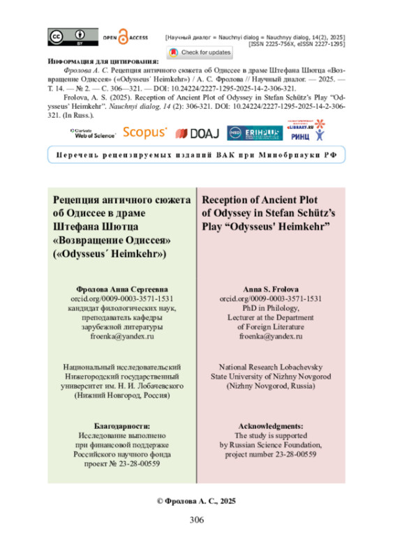 Анализируются особенности трансформации сюжета о возвращении Одиссея на Итаку в драме Штефана Шютца «Возвращение Одиссея» (1972). Актуальность исследования обусловлена представленными в пьесе стратегиями репрезентации современности, связанными с рецепцией античного наследия. Использованы культурно-исторический метод исследования, рецептивный и мифопоэтический подходы к анализу художественного текста. Сделан вывод, что все мифологические персонажи в пьесе подвергаются переосмыслению: образы Телемаха и Пенелопы травестируются и дегероизируются, Одиссей также лишен своей героичности. Проблема идентичности, связанная с образом Одиссея, интерпретируется как одна из центральных в пьесе. Её раскрытие структурно реализовано на композиционном уровне пьесы через мотив узнавания. Художественная работа с мифом Штефана Шютца оценивается как соответствующая основным тенденциям рецепции Античности в драматургии ГДР. Доказано, что пьеса имеет ярко выраженную социально-критическую направленность, связанную с изображением последствий тоталитарного строя и механизмов формирования идеологии. Демонстрируется воплощение этих идей в тексте драмы через метафору болезни как инструмента контроля над общественным сознанием.
