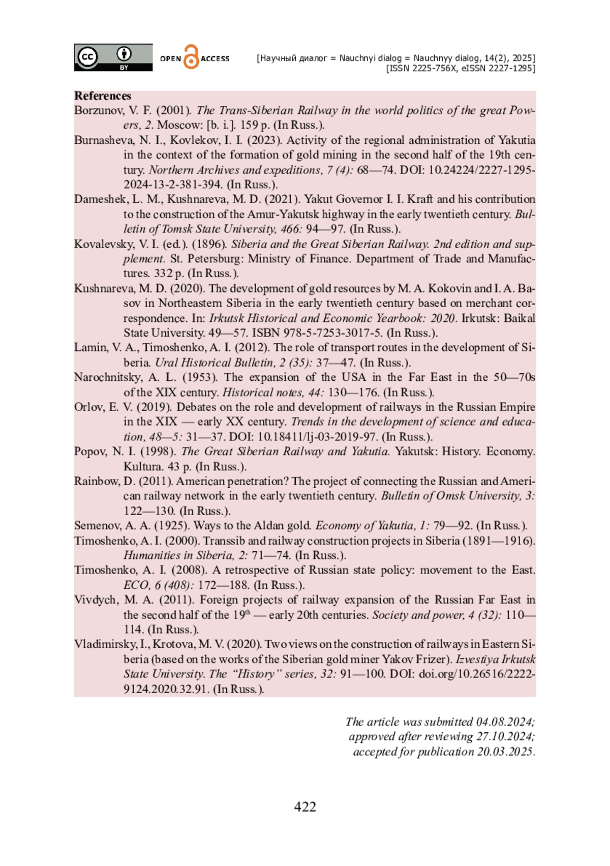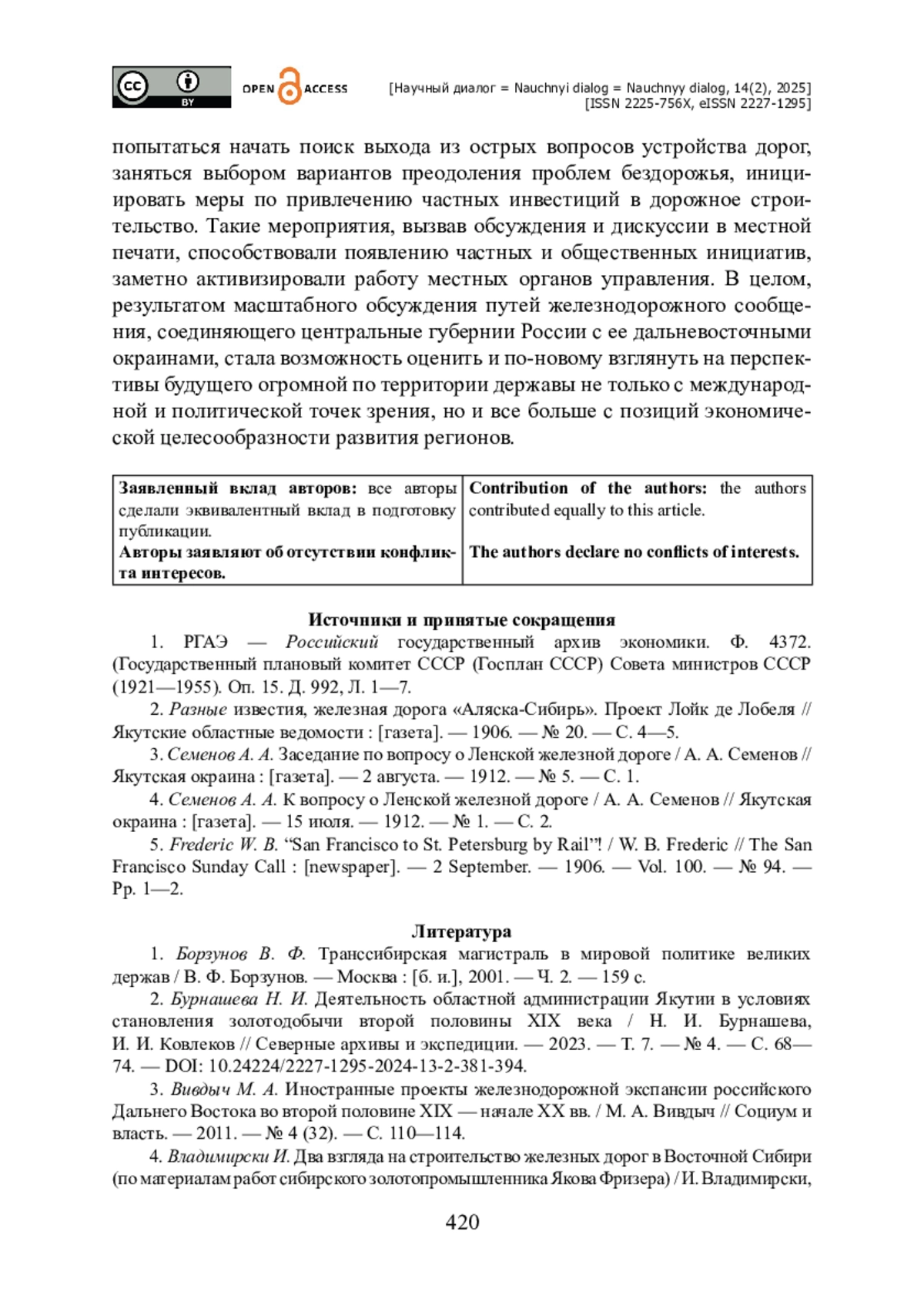 БУРНАШЕВА Н. И., КОВЛЕКОВ И. И. ПРОЕКТЫ НАЧАЛА ХХ ВЕКА ПО СТРОИТЕЛЬСТВУ ТРАНСПОРТНЫХ МАГИСТРАЛЕЙ К БОГАТСТВАМ НЕДР ЯКУТИИ // НАУЧНЫЙ ДИАЛОГ. 2025. ТОМ 14, № 2