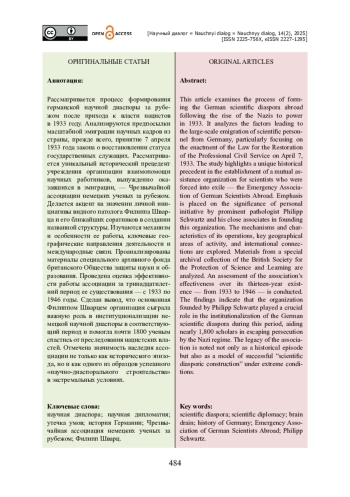 Рассматривается процесс формирования германской научной диаспоры за рубежом после прихода к власти нацистов в 1933 году. Анализируются предпосылки масштабной эмиграции научных кадров из страны, прежде всего, принятие 7 апреля 1933 года закона о восстановлении статуса государственных служащих. Рассматривается уникальный исторический прецедент учреждения организации взаимопомощи научных работников, вынужденно оказавшихся в эмиграции, — Чрезвычайной ассоциации немецких ученых за рубежом. Делается акцент на значении личной инициативы видного патолога Филиппа Шварца и его ближайших соратников в создании названной структуры. Изучаются механизм и особенности ее работы, ключевые географические направления деятельности и международные связи. Проанализированы материалы специального архивного фонда британского Общества защиты науки и образования. Проведена оценка эффективности работы ассоциации за тринадцатилетний период ее существования — с 1933 по 1946 годы. Сделан вывод, что основанная Филиппом Шварцем организация сыграла важную роль в институционализации немецкой научной диаспоры в соответствующий период и помогла почти 1800 ученым спастись от преследования нацистских властей. Отмечена значимость наследия ассоциации не только как исторического эпизода, но и как одного из образцов успешного «научно-диаспорального строительства» в экстремальных условиях.