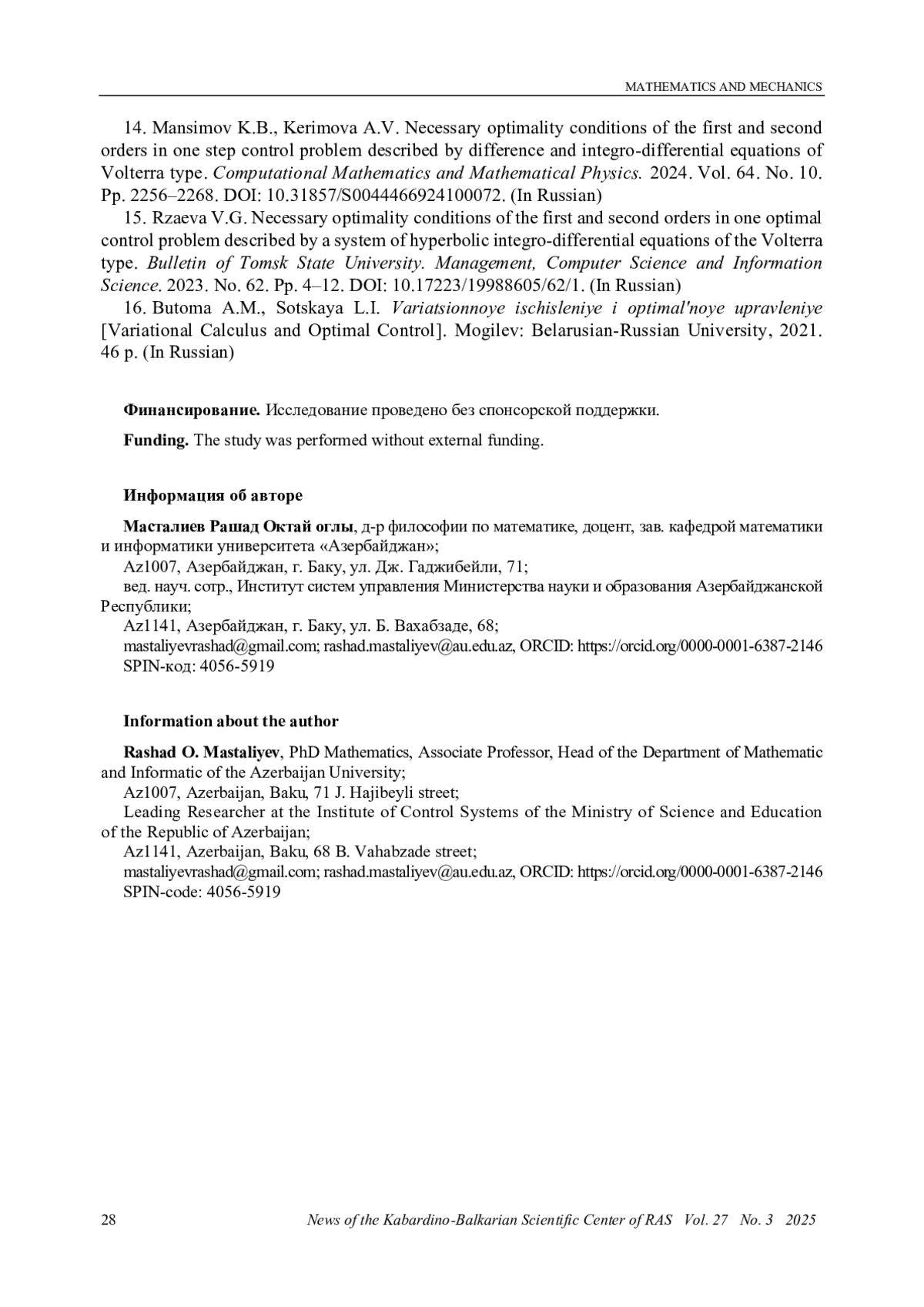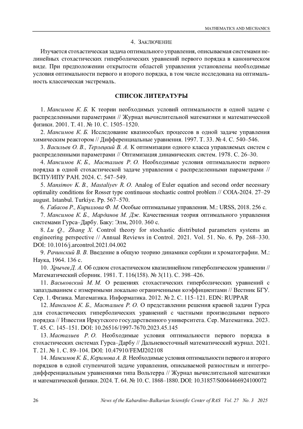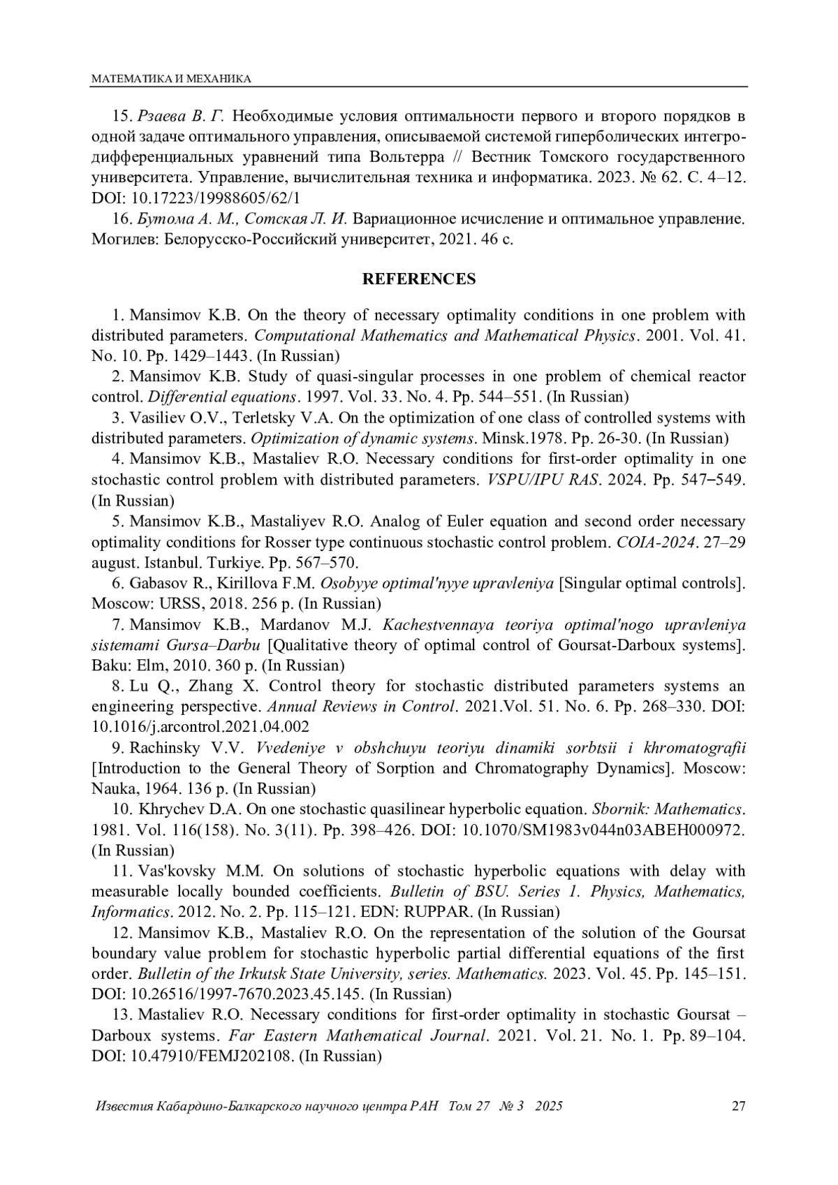 МАСТАЛИЕВ Р. О. НЕОБХОДИМЫЕ УСЛОВИЯ ОПТИМАЛЬНОСТИ ПЕРВОГО И ВТОРОГО ПОРЯДКОВ ДЛЯ НЕПРЕРЫВНОЙ СТОХАСТИЧЕСКОЙ ЗАДАЧИ УПРАВЛЕНИЯ ТИПА РОССЕРА // ИЗВЕСТИЯ КАБАРДИНО-БАЛКАРСКОГО НАУЧНОГО ЦЕНТРА РАН. 2025. ТОМ 27 № 3