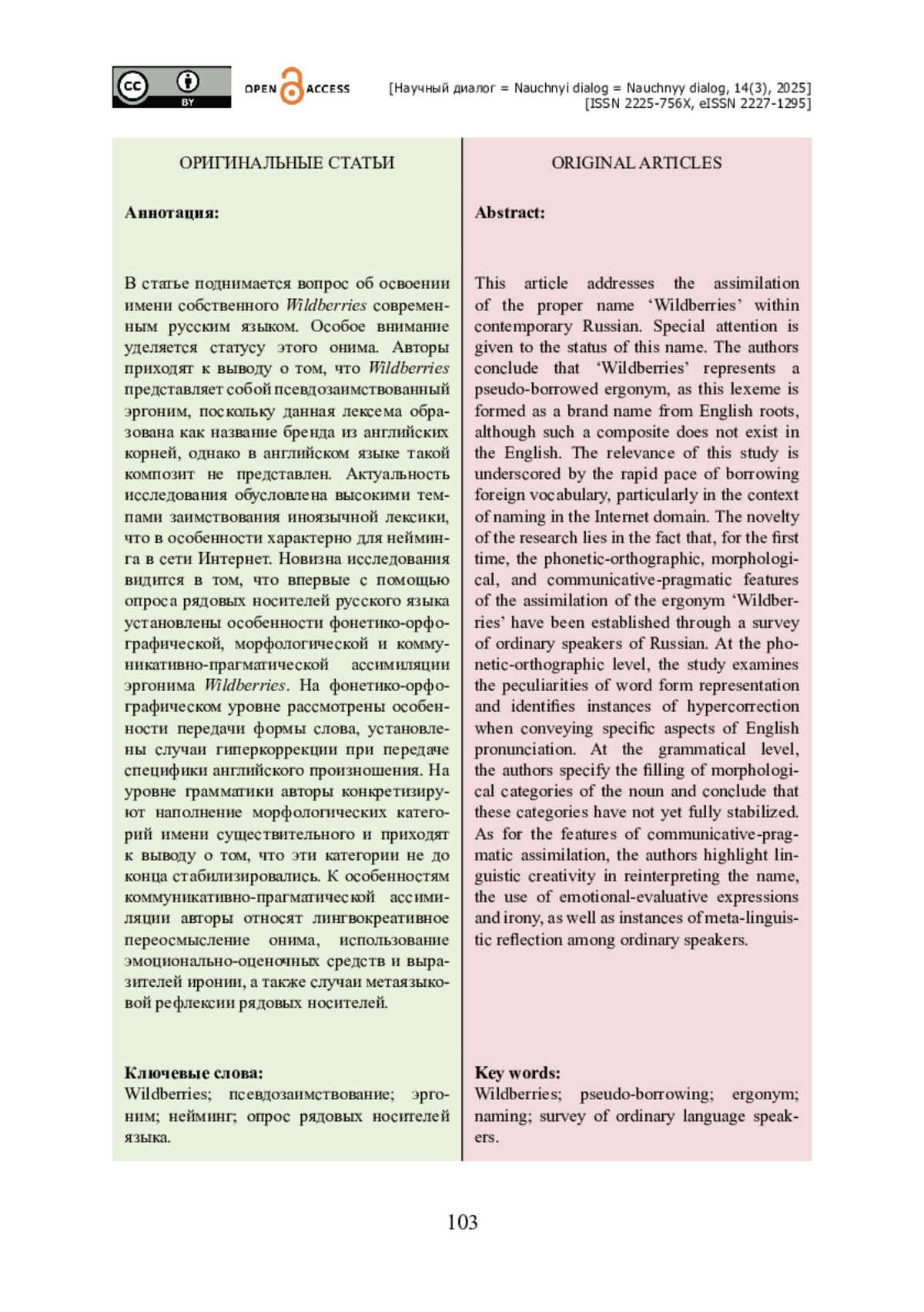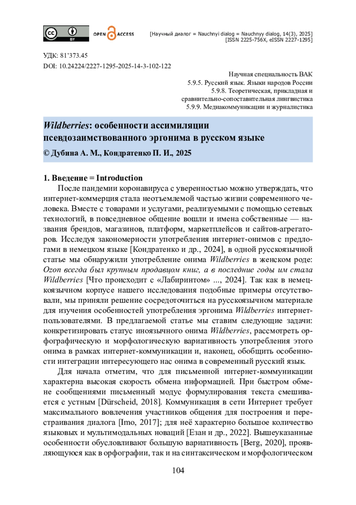 В статье поднимается вопрос об освоении имени собственного Wildberries современным русским языком. Особое внимание уделяется статусу этого онима. Авторы приходят к выводу о том, что Wildberries представляет собой псевдозаимствованный эргоним, поскольку данная лексема образована как название бренда из английских корней, однако в английском языке такой композит не представлен. Актуальность исследования обусловлена высокими темпами заимствования иноязычной лексики, что в особенности характерно для нейминга в сети Интернет. Новизна исследования видится в том, что впервые с помощью опроса рядовых носителей русского языка установлены особенности фонетико-орфографической, морфологической и коммуникативно-прагматической ассимиляции эргонима Wildberries. На фонетико-орфографическом уровне рассмотрены особенности передачи формы слова, установлены случаи гиперкоррекции при передаче специфики английского произношения. На уровне грамматики авторы конкретизируют наполнение морфологических категорий имени существительного и приходят к выводу о том, что эти категории не до конца стабилизировались. К особенностям коммуникативно-прагматической ассимиляции авторы относят лингвокреативное переосмысление онима, использование эмоционально-оценочных средств и выразителей иронии, а также случаи метаязыковой рефлексии рядовых носителей.