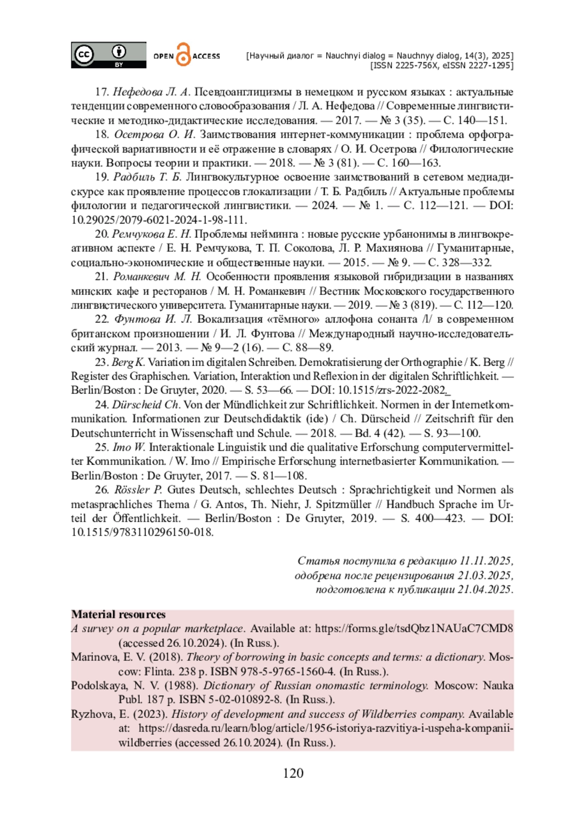 18. Осетрова О. И. Заимствования интернет-коммуникации : проблема орфографической вариативности и её отражение в словарях / О. И. Осетрова // Филологические науки. Вопросы теории и практики. - 2018. - № 3 (81). - С. 160-163.