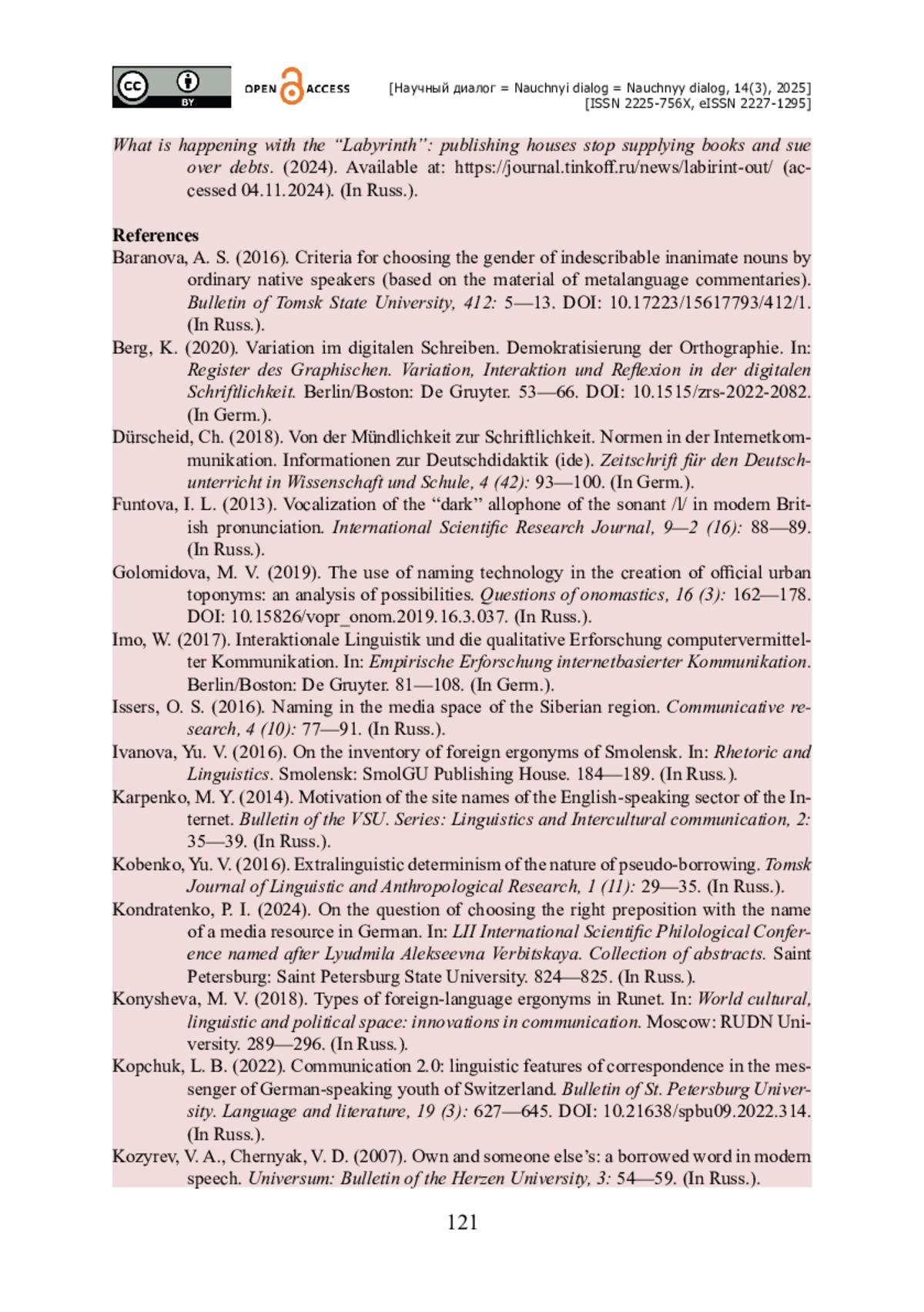 3. Волкова А. Б. Сегменты и субклассы псевдозаимствованных онимов в немецком литературном языке / А. Б. Волкова, Ю. В. Кобенко // СибСкрипт. - 2023. - Т. 25. - № 1. - С. 1-9. - https://doi.org/10.21603/sibscript-2023-25-1-1-9.