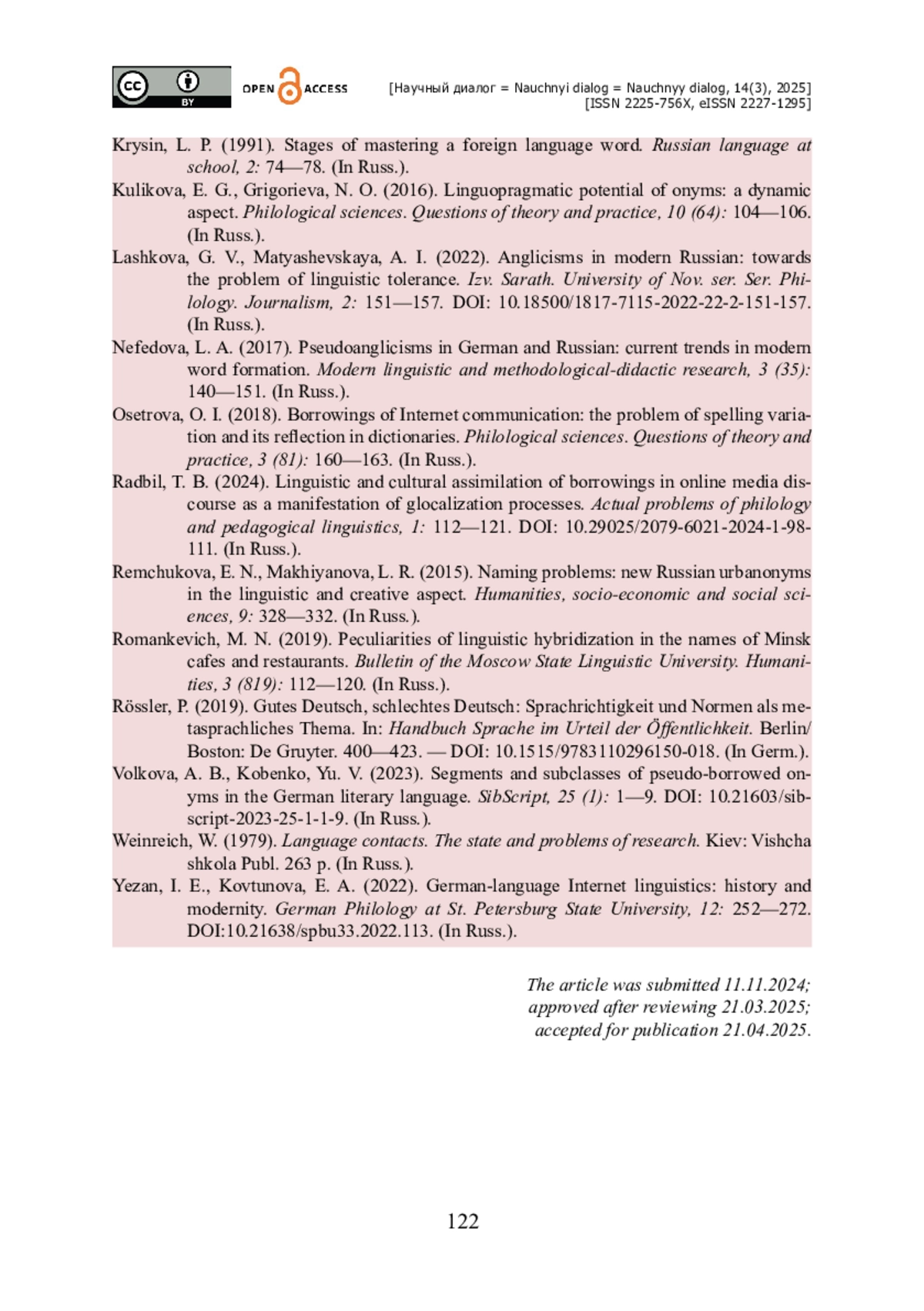 19. Радбиль Т. Б. Лингвокультурное освоение заимствований в сетевом медиадискурсе как проявление процессов глокализации / Т. Б. Радбиль // Актуальные проблемы филологии и педагогической лингвистики. - 2024. - № 1. - С. 112-121. - https://doi.org/10.29025/2079-6021-2024-1-98-111.