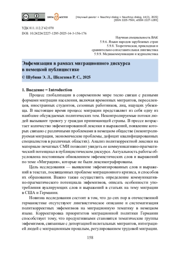 Проанализированы эвфемизированные слова и выражения на тему миграционного кризиса в статьях немецких электронных изданий «Taz», «Süddeutsche Zeitung» за 2024 год. Выбор данного периода объясняется повышенным вниманием немецкой прессы к событиям, которые связаны с миграционным кризисом в Германии и США. Актуальность исследования обусловлена тем, что проблемы в области миграции способствуют появлению новых политкорректных эвфемизмов и выражений. На основе таких критериев, как обозначение негативного денотата, улучшение характера денотата и др., была выявлена новая эвфемизированная лексика. Методом сплошной выборки было выделено 15 эвфемизированных номинаций. Авторы подробно комментируют каждый пример с позиций способов достижения эффекта эвфемизации. Предлагается классификация эвфемизмов миграционного дискурса по тематическим группам: мигранты, беженцы, депортация, депортированные. Авторы приходят к выводу о том, что немецкие авторы статей прибегают к таким способам эвфемизации, как словосложение и перифраза. Отмечается, что проблема миграции в статьях немецких авторов о Германии наиболее подвержена эвфемизации по сравнению с текстами статей о США.