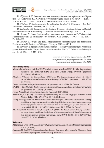 11. Шубина Э. Л. Эвфемистическая номинация бедности в публицистике Германии / Э. Л. Шубина, Ю. А. Райкова // Филологические науки в МГИМО. - 2023. - Т. 9. - № 2. - С. 79-91. - https://doi.org/10.24833/2410-2423-2023-2-35-79-91.