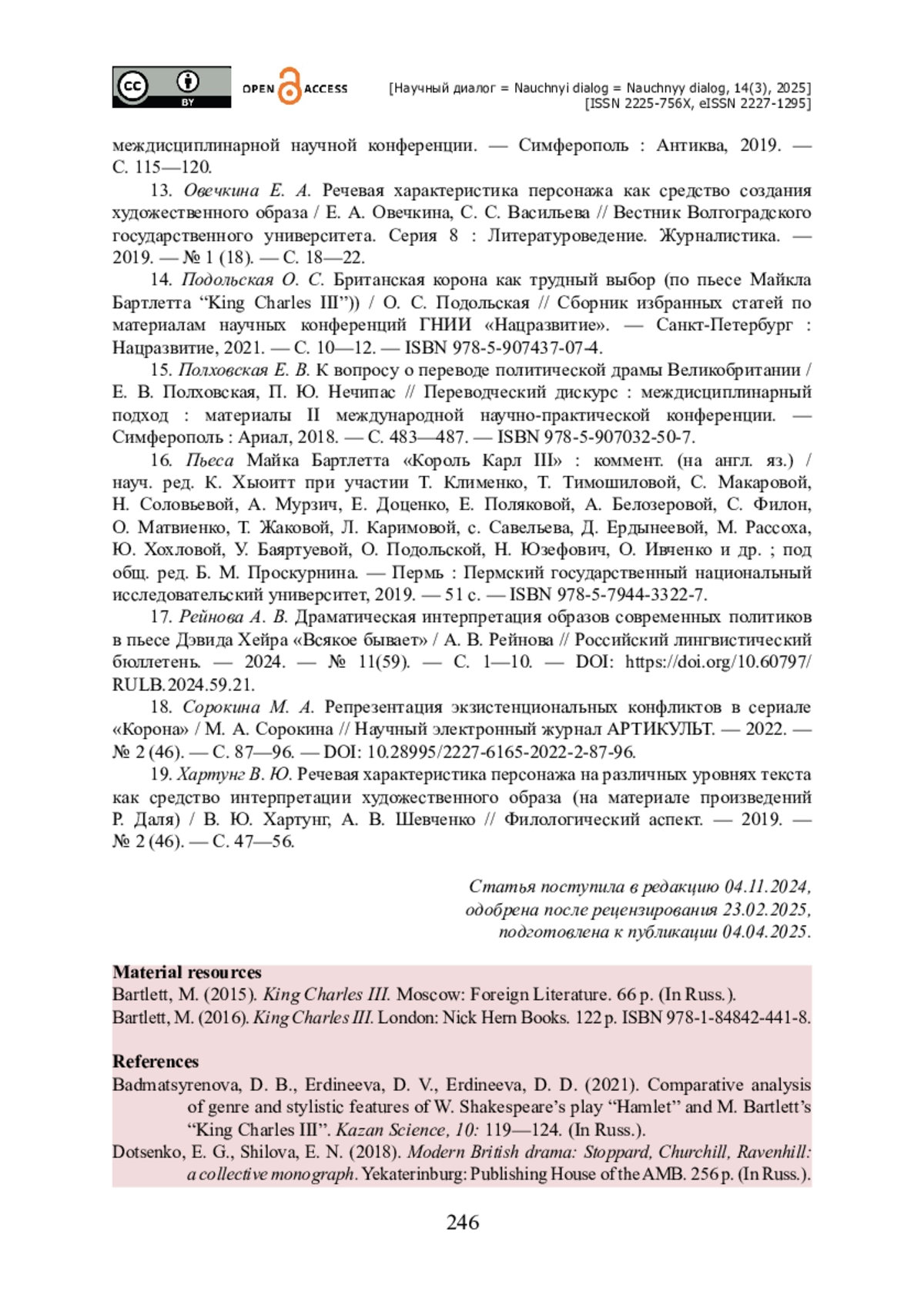 1. Бадмацыренова Д. Б. Сравнительный анализ жанрово-стилистических особенностей пьесы У. Шекспира “Hamlet” и М. Бартлетта “King Charles III” / Д. Б. Бадмацыренова, Д. В. Эрдынеева, Д. Д. Эрдынеева // Казанская наука. - 2021. - № 10. - С. 119-124.
