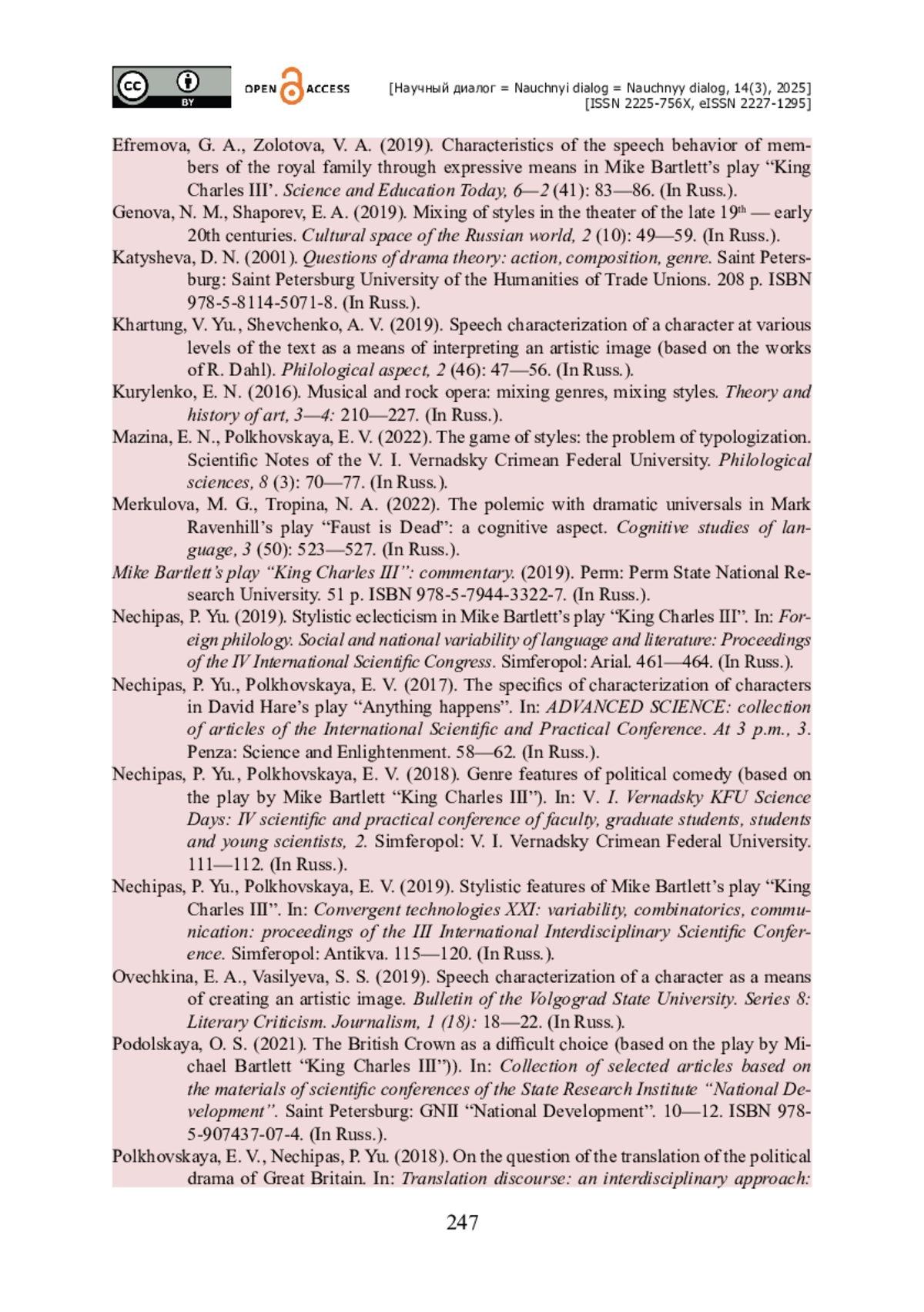 11. Нечипас П. Ю. Стилевая эклектика в пьесе Майка Бартлетта «Король Карл III» / П. Ю. Нечипас // Иностранная филология. Социальная и национальная вариативность языка и литературы : Материалы IV Международного научного конгресса, Симферополь : Ариал, 2019. - С. 461-464.