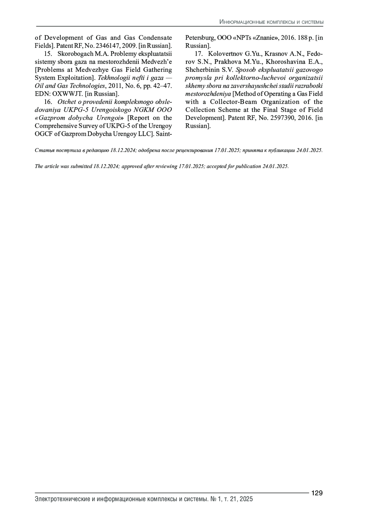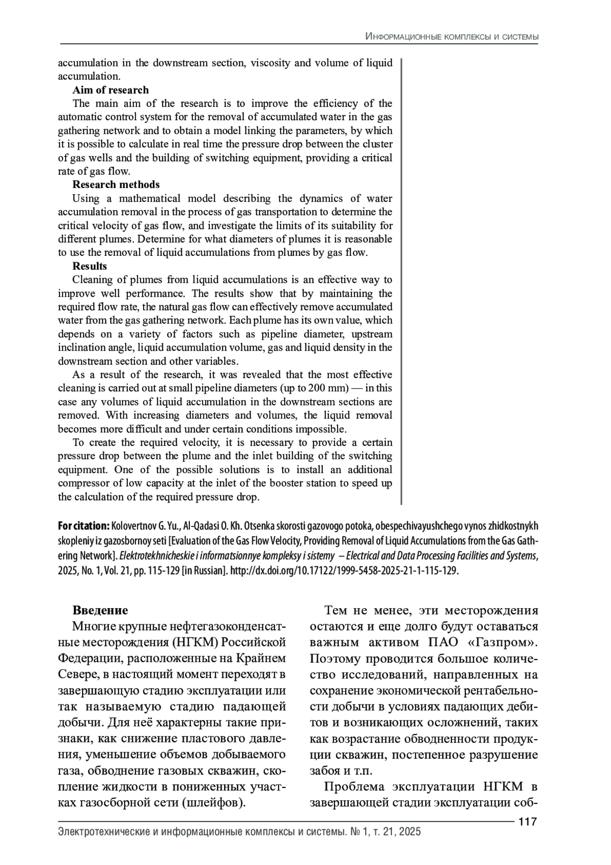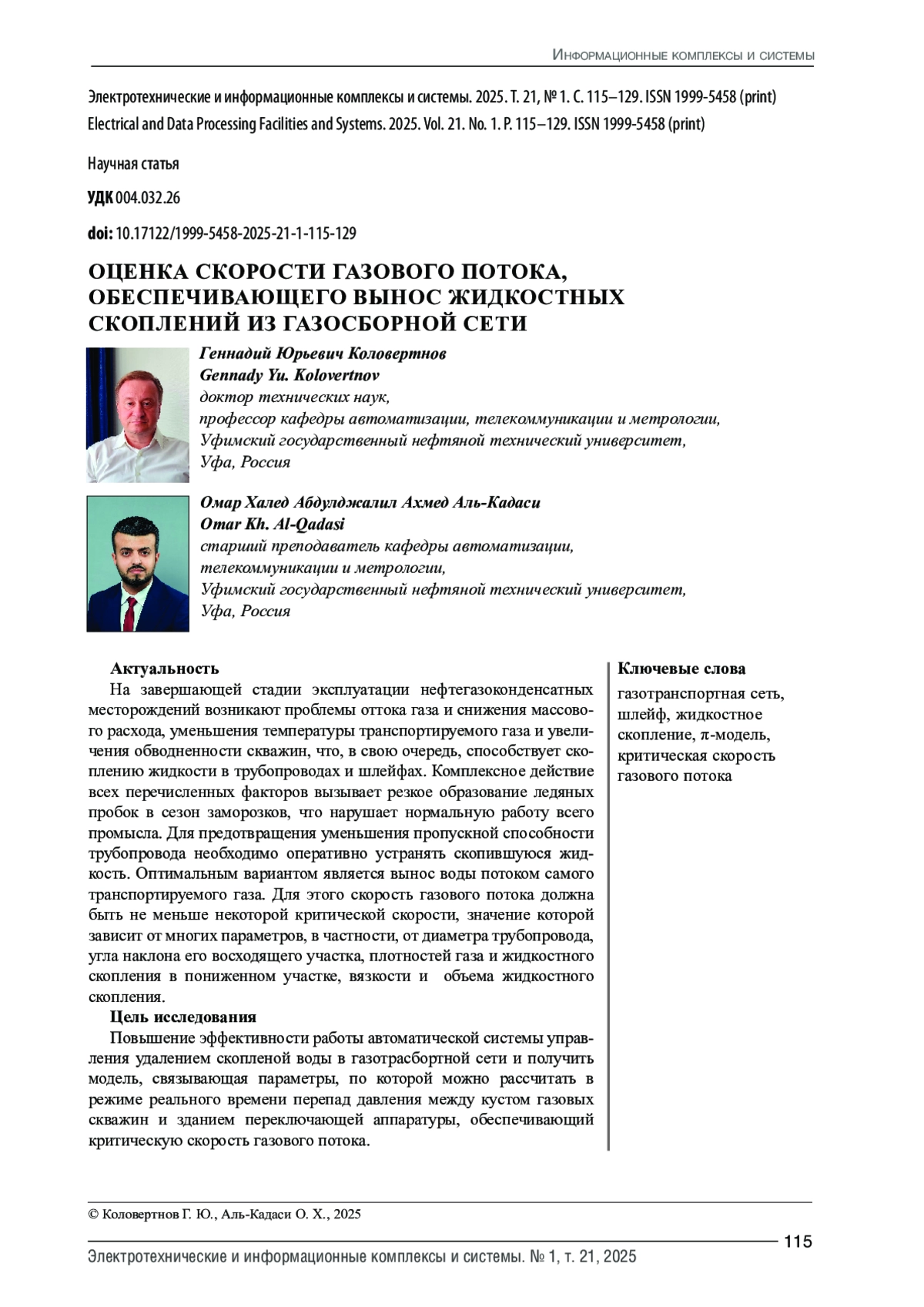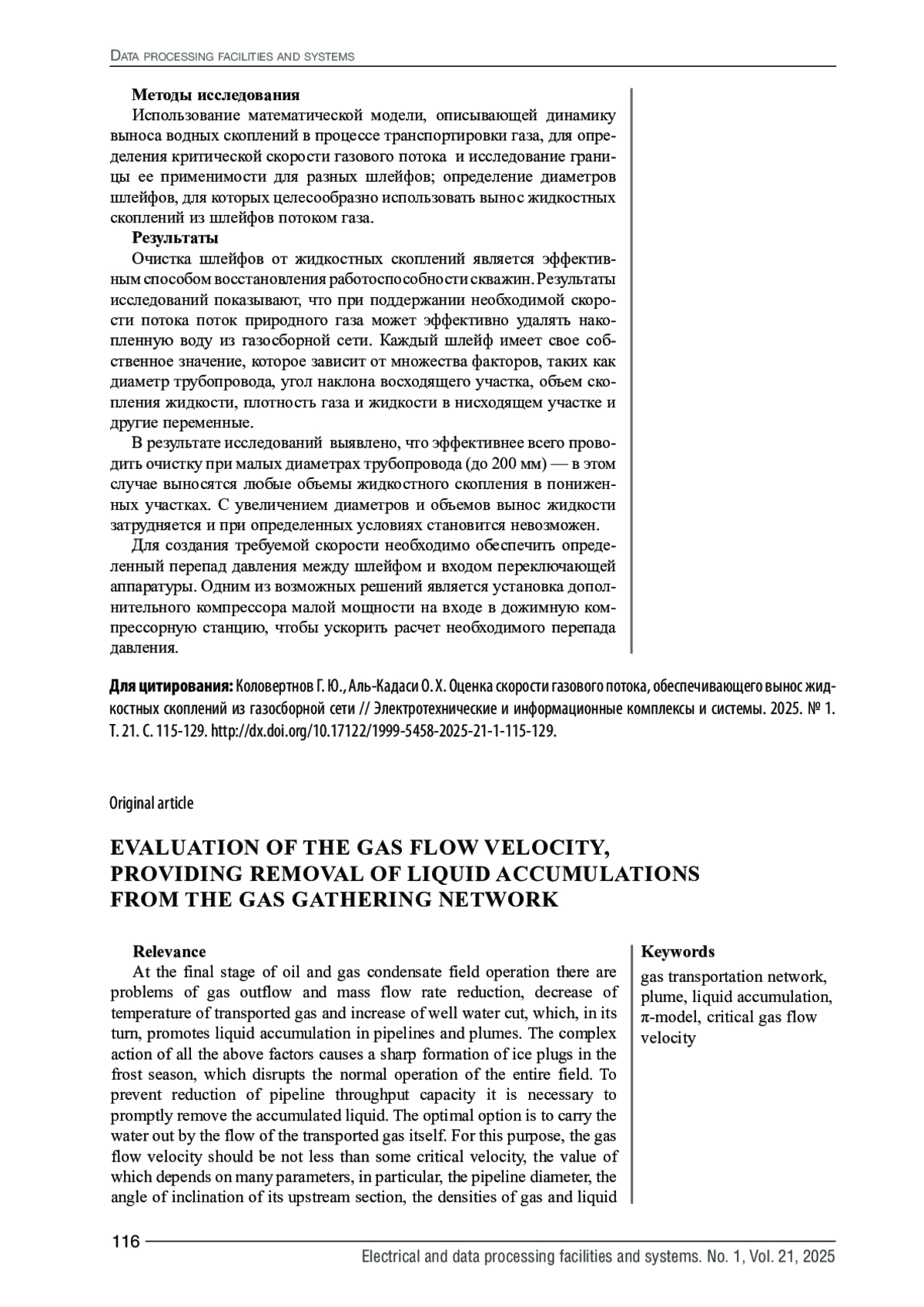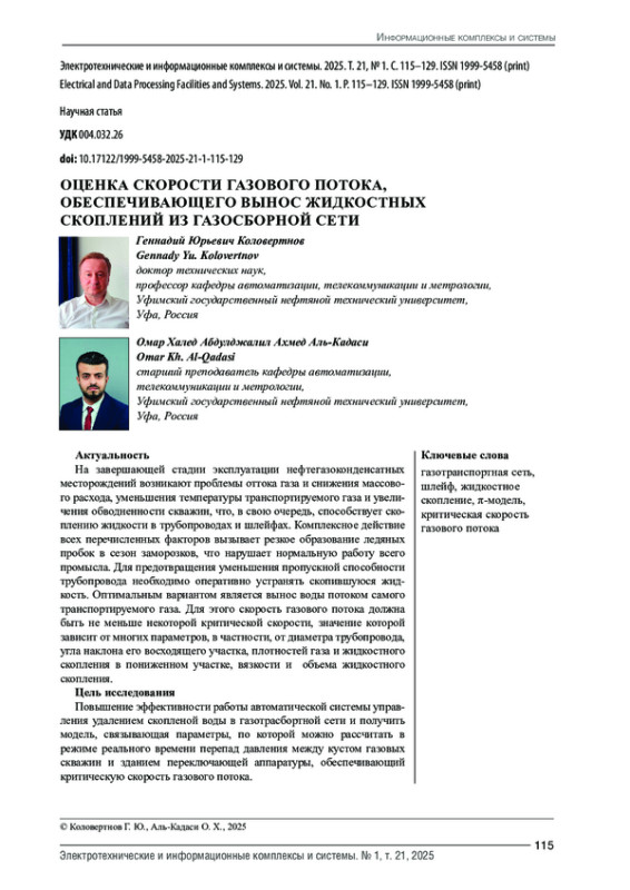 КОЛОВЕРТНОВ Г. Ю., АЛЬ-КАДАСИ О. Х. ОЦЕНКА СКОРОСТИ ГАЗОВОГО ПОТОКА, ОБЕСПЕЧИВАЮЩЕГО ВЫНОС ЖИДКОСТНЫХ СКОПЛЕНИЙ ИЗ ГАЗОСБОРНОЙ СЕТИ // ЭЛЕКТРОТЕХНИЧЕСКИЕ И ИНФОРМАЦИОННЫЕ КОМПЛЕКСЫ И СИСТЕМЫ. 2025. Т. 21 № 1
