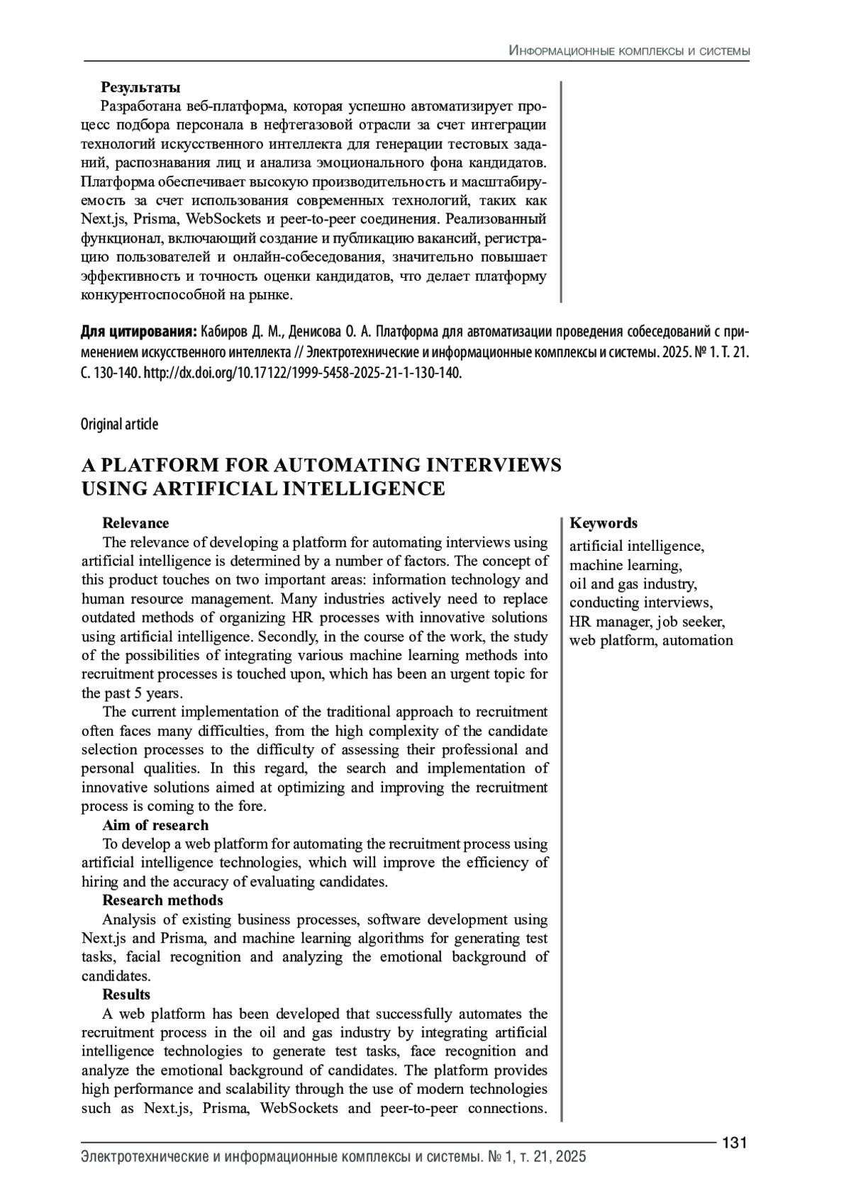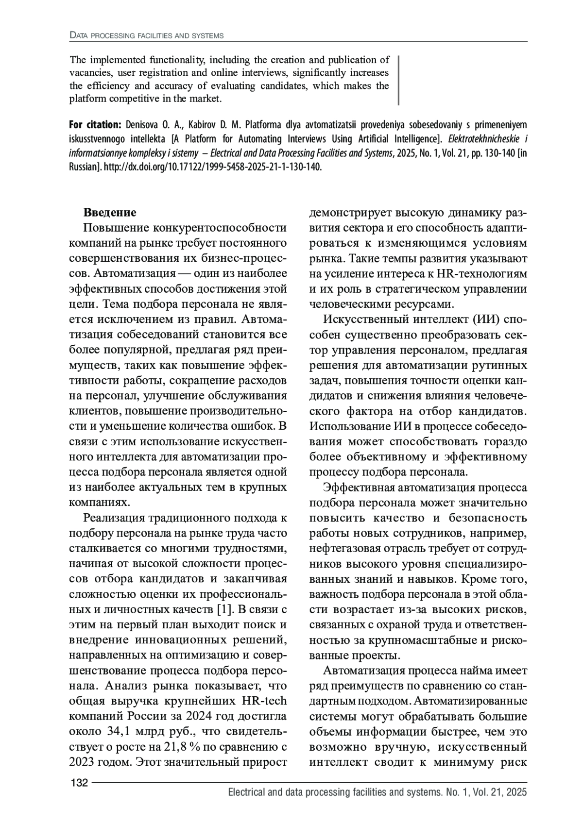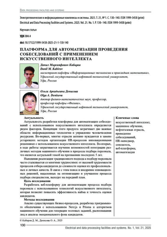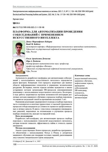 КАБИРОВ Д. М., ДЕНИСОВА О. А. ПЛАТФОРМА ДЛЯ АВТОМАТИЗАЦИИ ПРОВЕДЕНИЯ СОБЕСЕДОВАНИЙ С ПРИМЕНЕНИЕМ ИСКУССТВЕННОГО ИНТЕЛЛЕКТА // ЭЛЕКТРОТЕХНИЧЕСКИЕ И ИНФОРМАЦИОННЫЕ КОМПЛЕКСЫ И СИСТЕМЫ. 2025. Т. 21 № 1