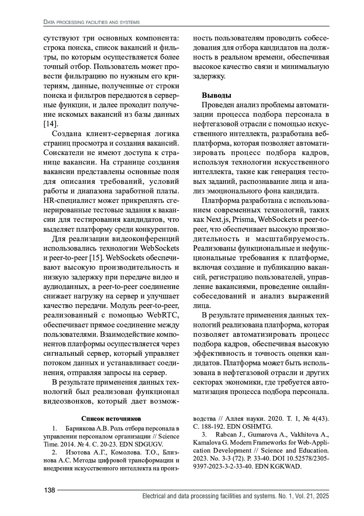 Актуальность Актуальность разработки платформы для автоматизации собеседований с использованием искусственного интеллекта определяется рядом факторов. Концепция этого продукта затрагивает две важные области: информационные технологии и управление человеческими ресурсами. Во-первых, многие отрасли активно нуждаются в замене устаревших методов организации HR-процессов инновационными решениями с использованием искусственного интеллекта. Во-вторых, в ходе работы затрагивается изучение возможностей интеграции различных методов машинного обучения в процессы подбора персонала, что является актуальной темой на протяжении последних 5 лет. Нынешняя реализация традиционного подхода к подбору персонала часто сталкивается со многими трудностями: от высокой трудоемкости процессов отбора кандидатов до сложности оценки их профессиональных и личных качеств. В связи с этим поиск и внедрение инновационных решений, нацеленных на оптимизацию и улучшение процесса подбора специалистов, выходит на передний план. Цель исследования Разработать веб-платформу для автоматизации процесса подбора персонала с использованием технологий искусственного интеллекта, которая позволит повысить эффективность найма и точность оценки кандидатов. Методы исследования Анализ существующих бизнес-процессов, разработка программного обеспечения с использованием Next. js и Prisma и алгоритмов машинного обучения для генерации тестовых заданий, распознавания лиц и анализа эмоционального фона кандидатов. Результаты Разработана веб-платформа, которая успешно автоматизирует процесс подбора персонала в нефтегазовой отрасли за счет интеграции технологий искусственного интеллекта для генерации тестовых заданий, распознавания лиц и анализа эмоционального фона кандидатов. Платформа обеспечивает высокую производительность и масштабируемость за счет использования современных технологий, таких как Next. js, Prisma, WebSockets и peer-to-peer соединения. Реализованный функционал, включающий создание и публикацию вакансий, регистрацию пользователей и онлайн-собеседования, значительно повышает эффективность и точность оценки кандидатов, что делает платформу конкурентоспособной на рынке.