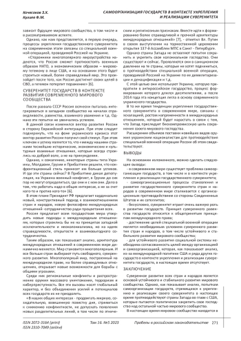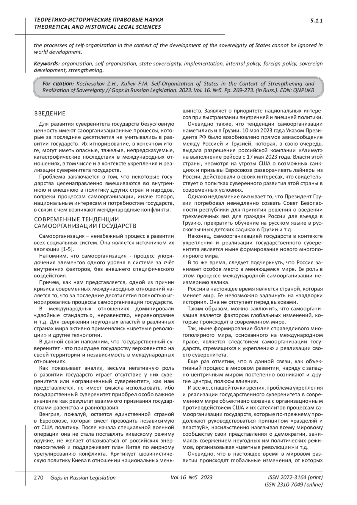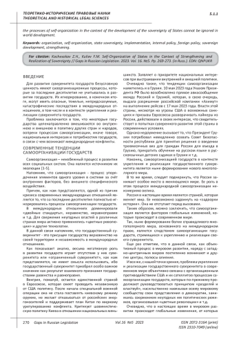 В данной статье исследуется проблема укрепления и реализации суверенитета государств в контексте их самоорганизации. Для устойчивого развития социальной системы необходима согласованность целей между организацией и самоорганизацией, которая, как показывает анализ, из-за международной политики США и ряда других государств в контексте укрепления и реализации суверенитета государств, в настоящее время отсутствует. Цель исследования - показать, что попыткам самоорганизации государств, стремящихся к укреплению и реализации своего суверенитета в настоящее время противодействуют страны Запада во главе с США, которые пытаются политически закрепить свое господство над остальной частью мирового сообщества. Выводы. В настоящее время в развитии мирового сообщества существует проблема самоорганизации государств, в том числе и в контексте укрепления и реализации суверенитета, что может иметь тяжелые, катастрофические последствия в мировом развитии. Вместе с тем суверенитет играет очень важную роль в развитии государств. Принцип суверенного равенства государств относится к общепринятым принципам международного права. Иначе говоря, в мировом развитии нельзя игнорировать процессы самоорганизации в контексте развития суверенитета государств.