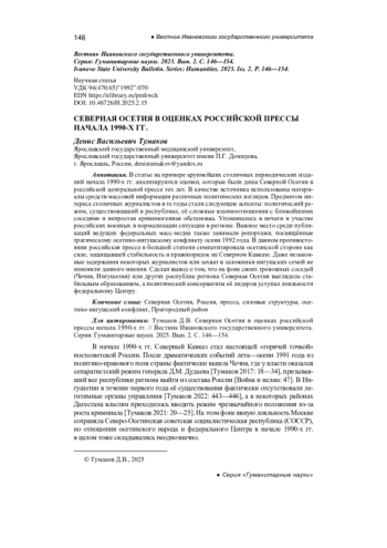В статье на примере крупнейших столичных периодических изданий начала 1990-х гг. анализируются оценки, которые были даны Северной Осетии в российской центральной прессе тех лет. В качестве источника использованы материалы средств массовой информации различных политических взглядов. Предметом интереса столичных журналистов в те годы стали следующие аспекты: политический режим, существовавший в республике, её сложные взаимоотношения с ближайшими соседями и непростая криминогенная обстановка. Упоминалось в печати и участие российских военных в нормализации ситуации в регионе. Важное место среди публикаций ведущих федеральных масс-медиа также занимали репортажи, посвящённые трагическому осетино-ингушскому конфликту осени 1992 года. В данном противостоянии российская пресса в большей степени симпатизировала осетинской стороне как силе, защищавшей стабильность и правопорядок на Северном Кавказе. Даже незаконные задержания некоторых журналистов или захват в заложники ингушских семей не изменили данного мнения. Сделан вывод о том, что на фоне своих тревожных соседей (Чечня, Ингушетия) или других республик региона Северная Осетия выглядела стабильным образованием, а политический консерватизм её лидеров уступал лояльности федеральному Центру