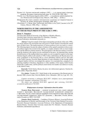 Tumakov D.V. The Ossetian-Ingush armed conflict of 1992 in the coverage of the Russian central press, Historia provinciae - Journal of Regional History, vol. 6, no. 2, pp. 439-484. - In Russ.
