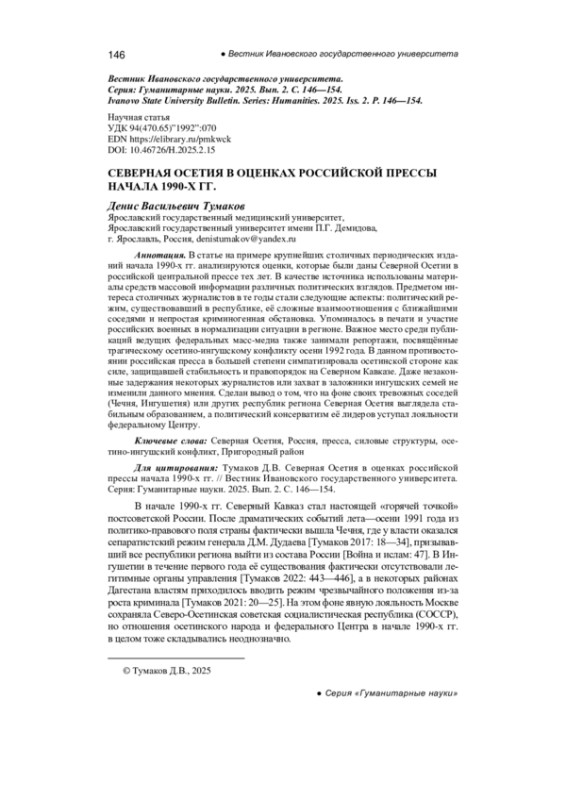 22. Тумаков Д.В. Осетино-ингушский вооружённый конфликт 1992 года в освещении российской центральной печати // Historia provinciae - Журнал региональной истории. 2022. Т. 6, № 2. С. 439-484. EDN: VQPZSX