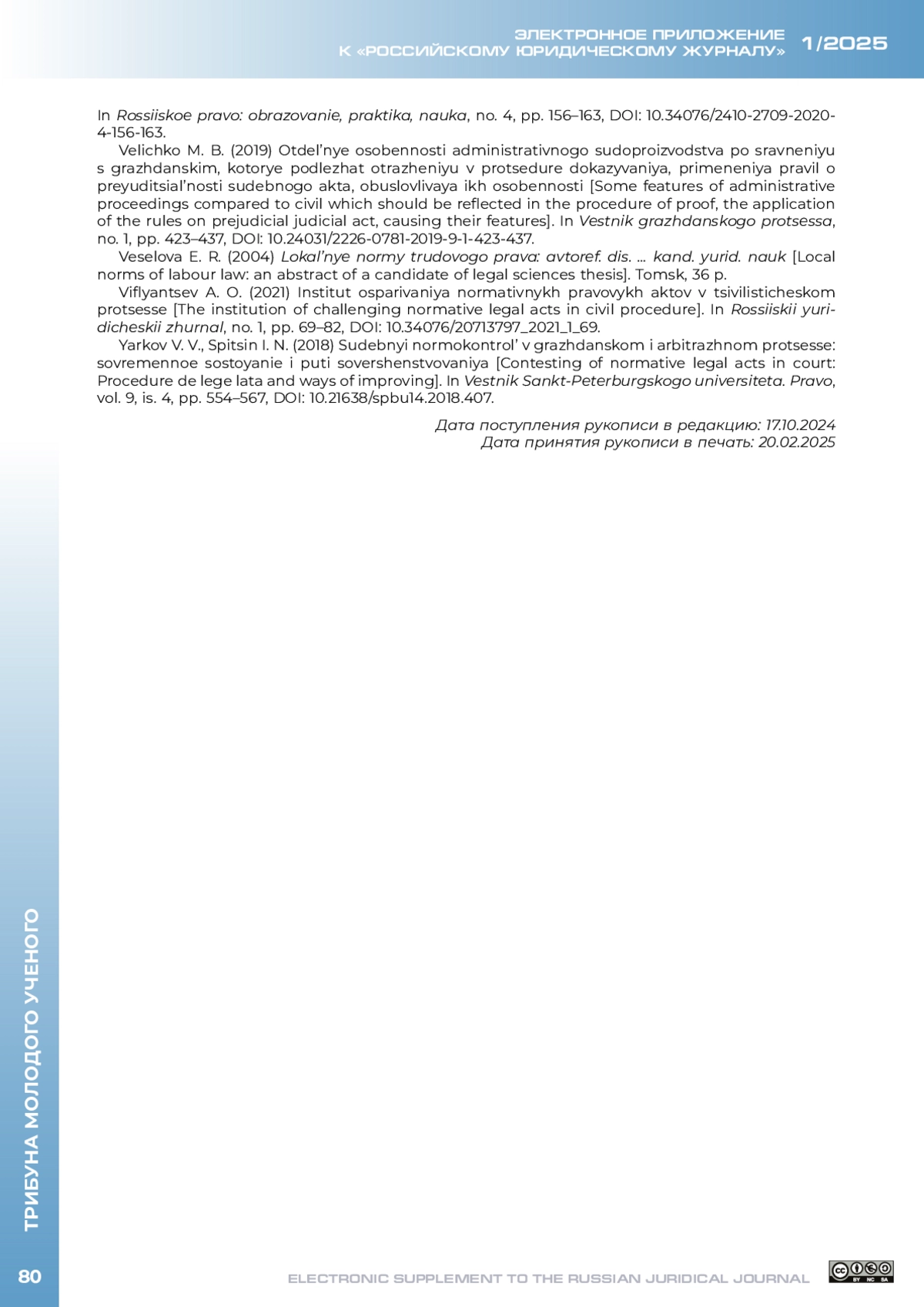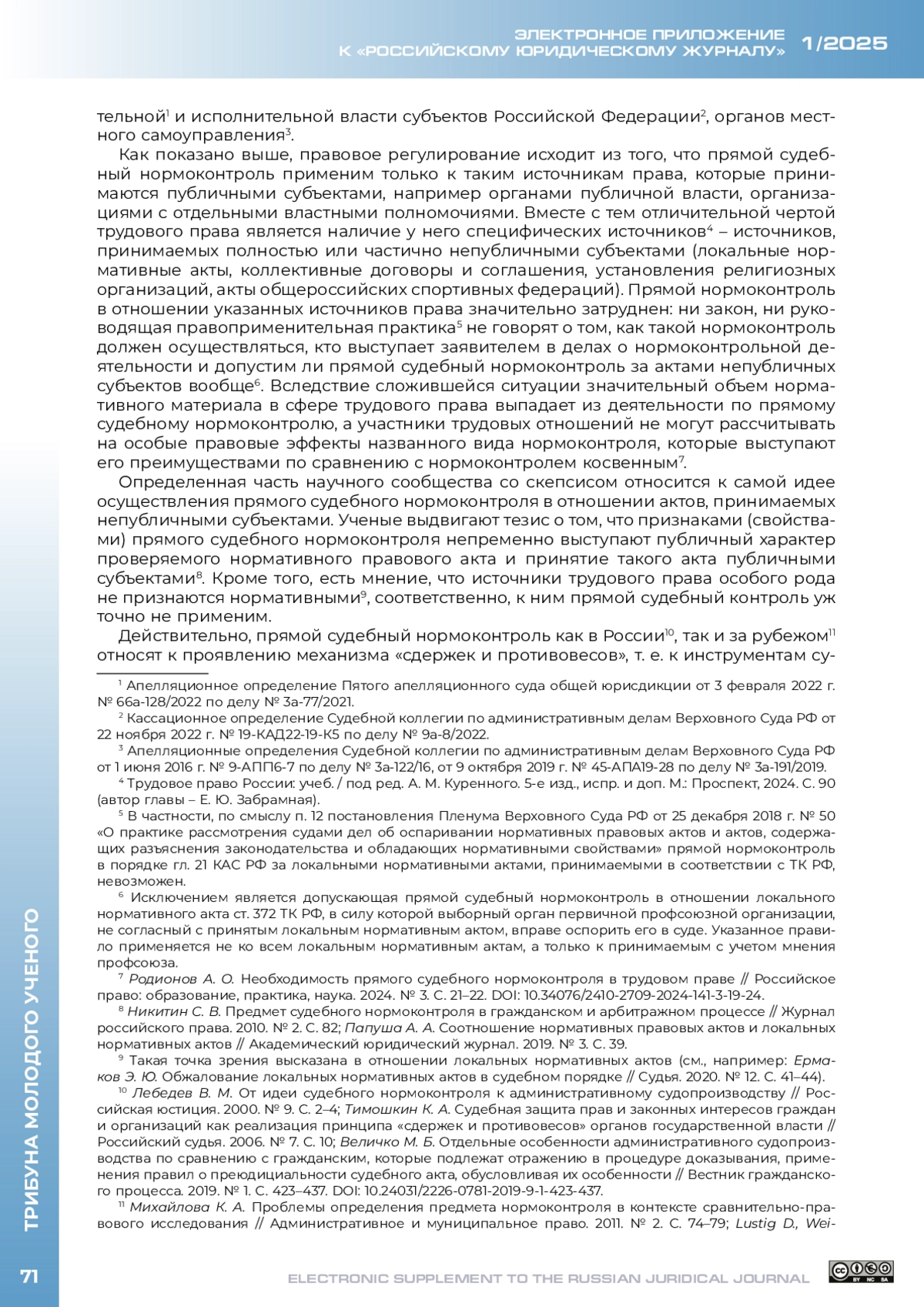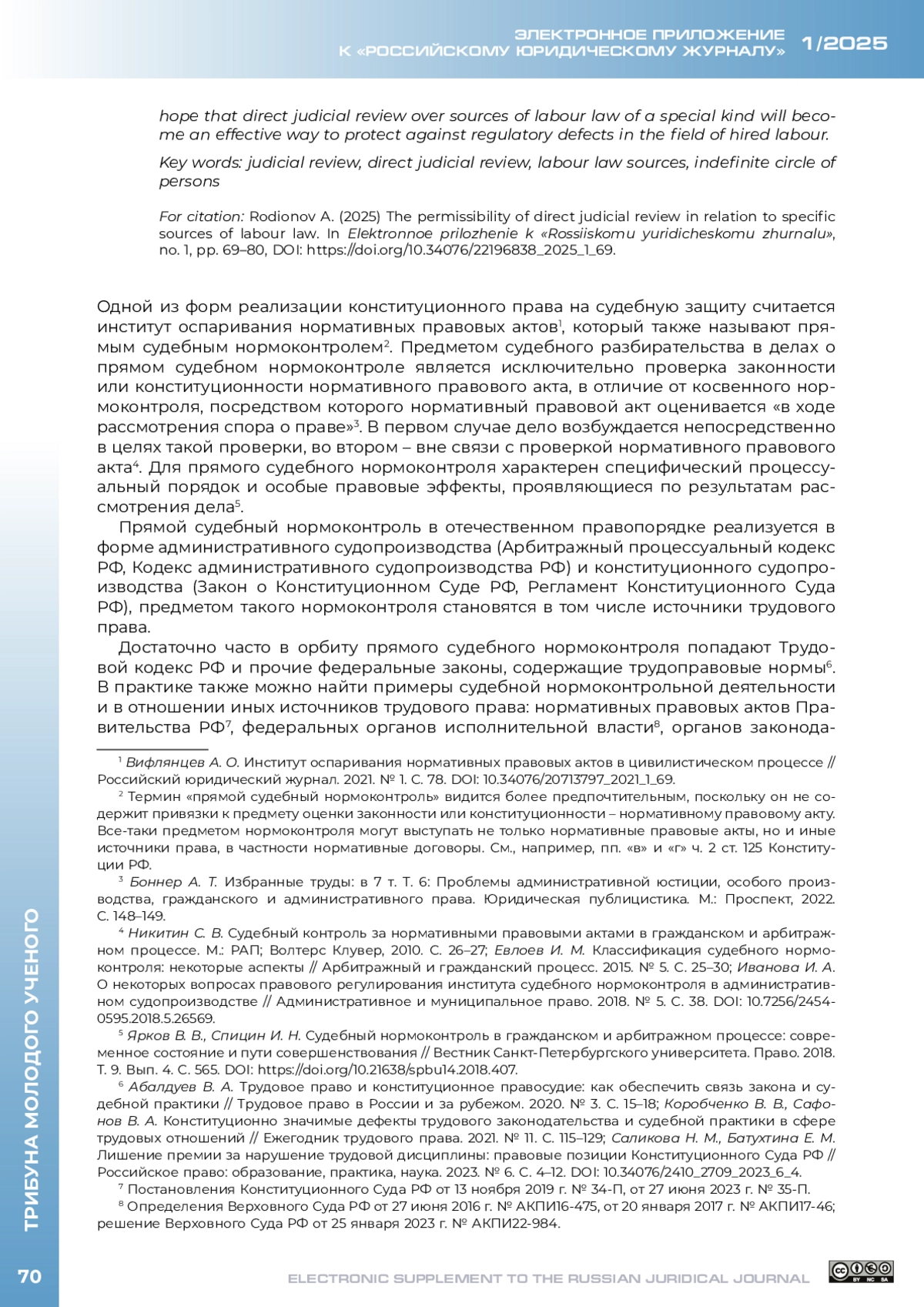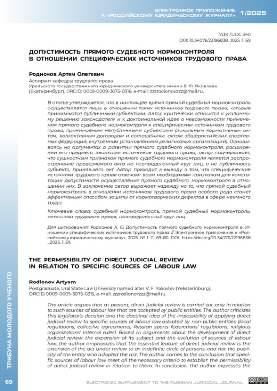 РОДИОНОВ А. О. ДОПУСТИМОСТЬ ПРЯМОГО СУДЕБНОГО НОРМОКОНТРОЛЯ В ОТНОШЕНИИ СПЕЦИФИЧЕСКИХ ИСТОЧНИКОВ ТРУДОВОГО ПРАВА // ЭЛЕКТРОННОЕ ПРИЛОЖЕНИЕ К РОССИЙСКОМУ ЮРИДИЧЕСКОМУ ЖУРНАЛУ. 2025. № 1