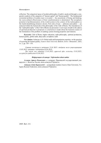 Статья посвящена реконструкции философии Римского клуба и его идейного лидера Аурелио Печчеи в контексте представлений о человеческом качестве. Отмечено, что проблематика человеческого качества неизменно присутствует в контексте глобальной рефлексии. Проанализировано категориальное пространство современной философии аудита через компаративный анализ категорий «человеческий капитал» и «человеческое качество». Выявлена фундаментальная экзистенциальная проблема современного человека — асинхронность бытия и мышления, определена социокультурная эффективность их синхронизации. Показан ноосферный потенциал проблематизации мир-системы в контексте техносферы как четвертого дестабилизирующего элемента. Разобраны новые роли человека — арбитра и аудитора — в рамках философии Римского клуба. Представлены основания «аудиторской философии» Римского клуба. Предложен новый тип аудита в сфере духовного производства — ноосферный аудит. Сделан вывод об эвристичности постановки проблемы аудита системообразующих свойств и отношений