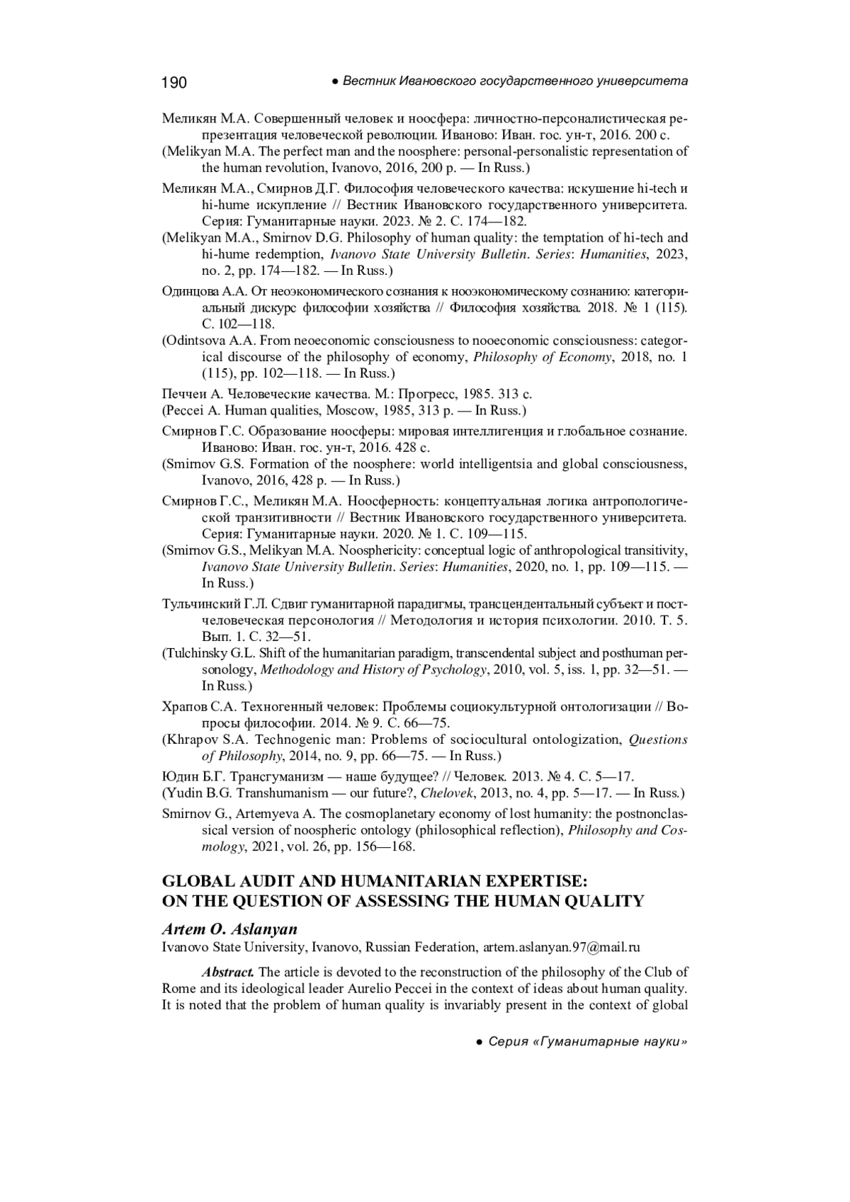 8. Смирнов Г.С., Меликян М.А. Ноосферность: концептуальная логика антропологической транзитивности // Вестник Ивановского государственного университета. Серия: Гуманитарные науки. 2020. № 1. С. 109-115. EDN: GNBHSD