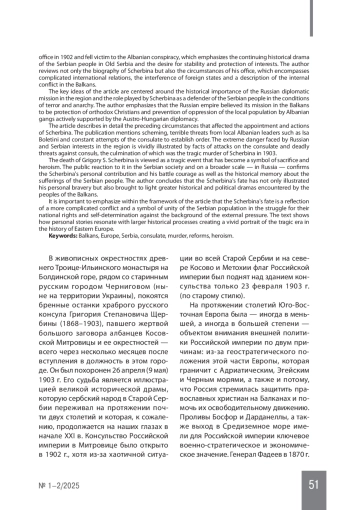 Статья повествует о трагической судьбе русского консула Григория Степановича Щербины, который служил в Митровице (ныне часть Косова) во время политической нестабильности и насилия в начале XX века. Щербина, пришедший на должность в 1902 г., стал жертвой заговора албанцев, что подчеркивает продолжающуюся историческую драму сербского народа в Старой Сербии и его стремление к стабильности и защите своих интересов. Автор рассматривает не только биографию Щербины, но и контекст его службы, который включает в себя сложные международные отношения, вмешательство иностранных держав и описание внутреннего конфликта на Балканах.