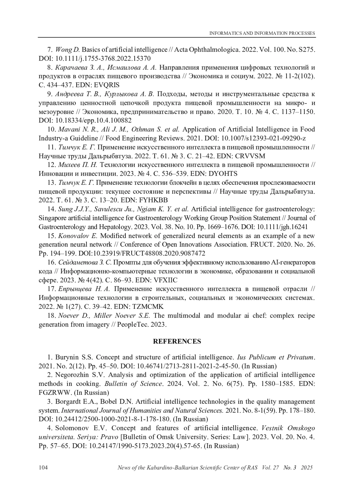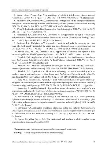 17. Епрынцева Н. А. Применение искусственного интеллекта в пищевой отрасли // Информационные технологии в строительных, социальных и экономических системах. 2022. № 1(27). С. 39-42. EDN: TZMCMK
