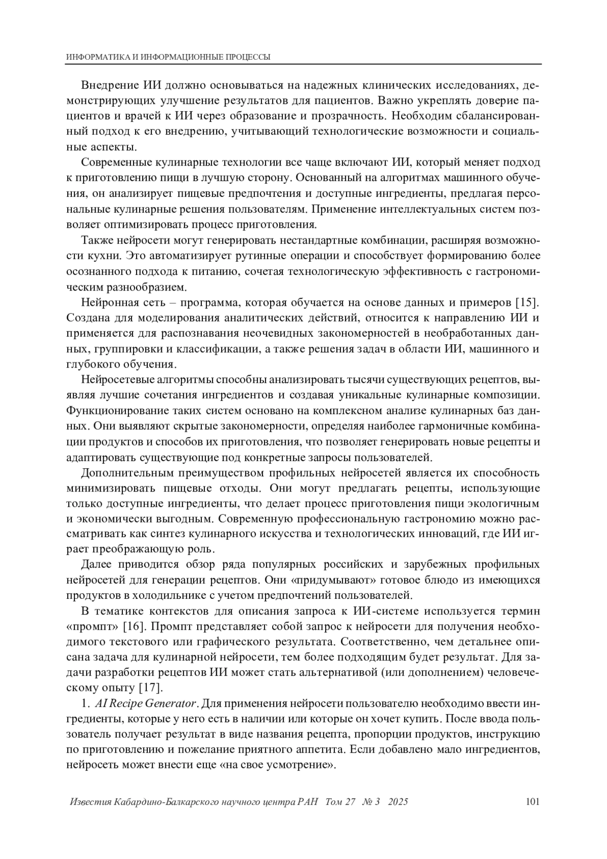 2. Негорожин С. В. Анализ и оптимизация применения методов искусственного интеллекта в кулинарии // Вестник науки. 2024. Т. 2. № 6(75). С. 1580-1585. EDN: FGZRWW