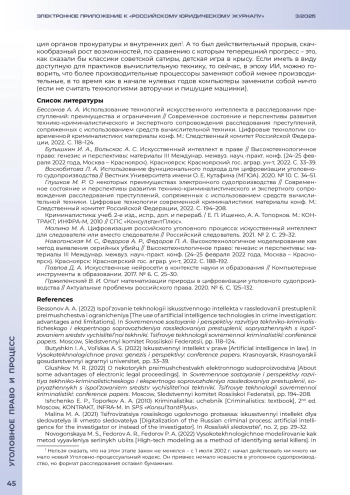 1. Бессонов А. А. Использование технологий искусственного интеллекта в расследовании преступлений: преимущества и ограничения // Современное состояние и перспективы развития технико-криминалистического и экспертного сопровождения расследования преступлений, сопряженных с использованием средств вычислительной техники. Цифровые технологии современной криминалистики: материалы конф. М.: Следственный комитет Российской Федерации, 2022. С. 118-124. EDN: LLGWJY