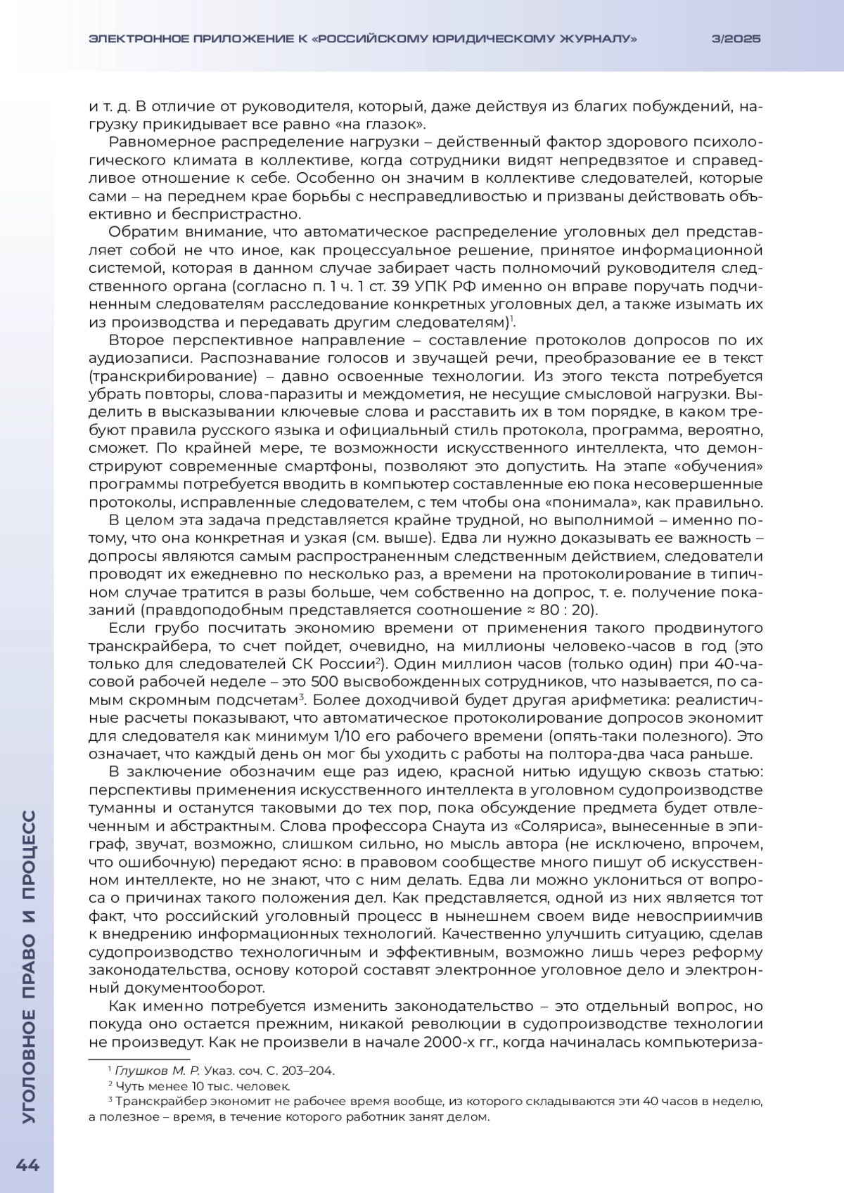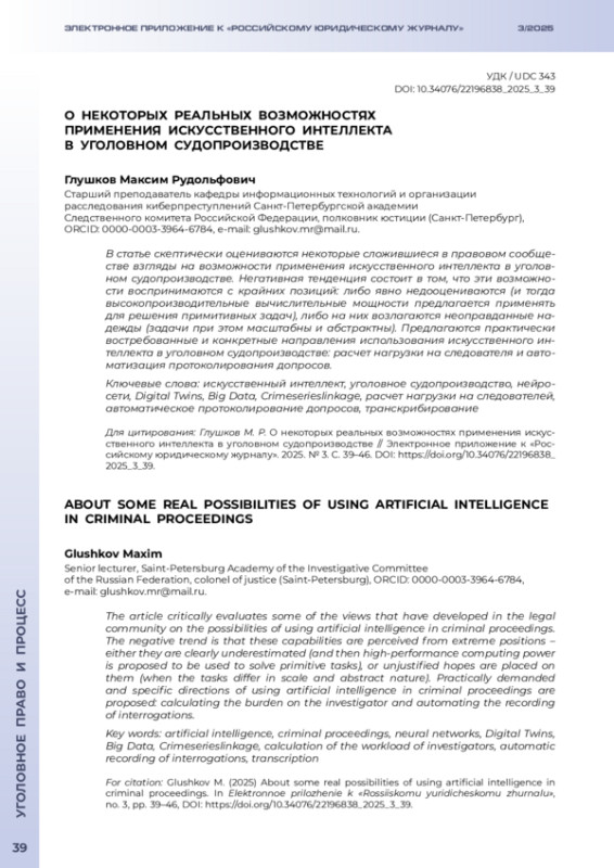 В статье скептически оцениваются некоторые сложившиеся в правовом сообществе взгляды на возможности применения искусственного интеллекта в уголовном судопроизводстве. Негативная тенденция состоит в том, что эти возможности воспринимаются с крайних позиций: либо явно недооцениваются (и тогда высокопроизводительные вычислительные мощности предлагается применять для решения примитивных задач), либо на них возлагаются неоправданные надежды (задачи при этом масштабны и абстрактны). Предлагаются практически востребованные и конкретные направления использования искусственного интеллекта в уголовном судопроизводстве: расчет нагрузки на следователя и автоматизация протоколирования допросов.
