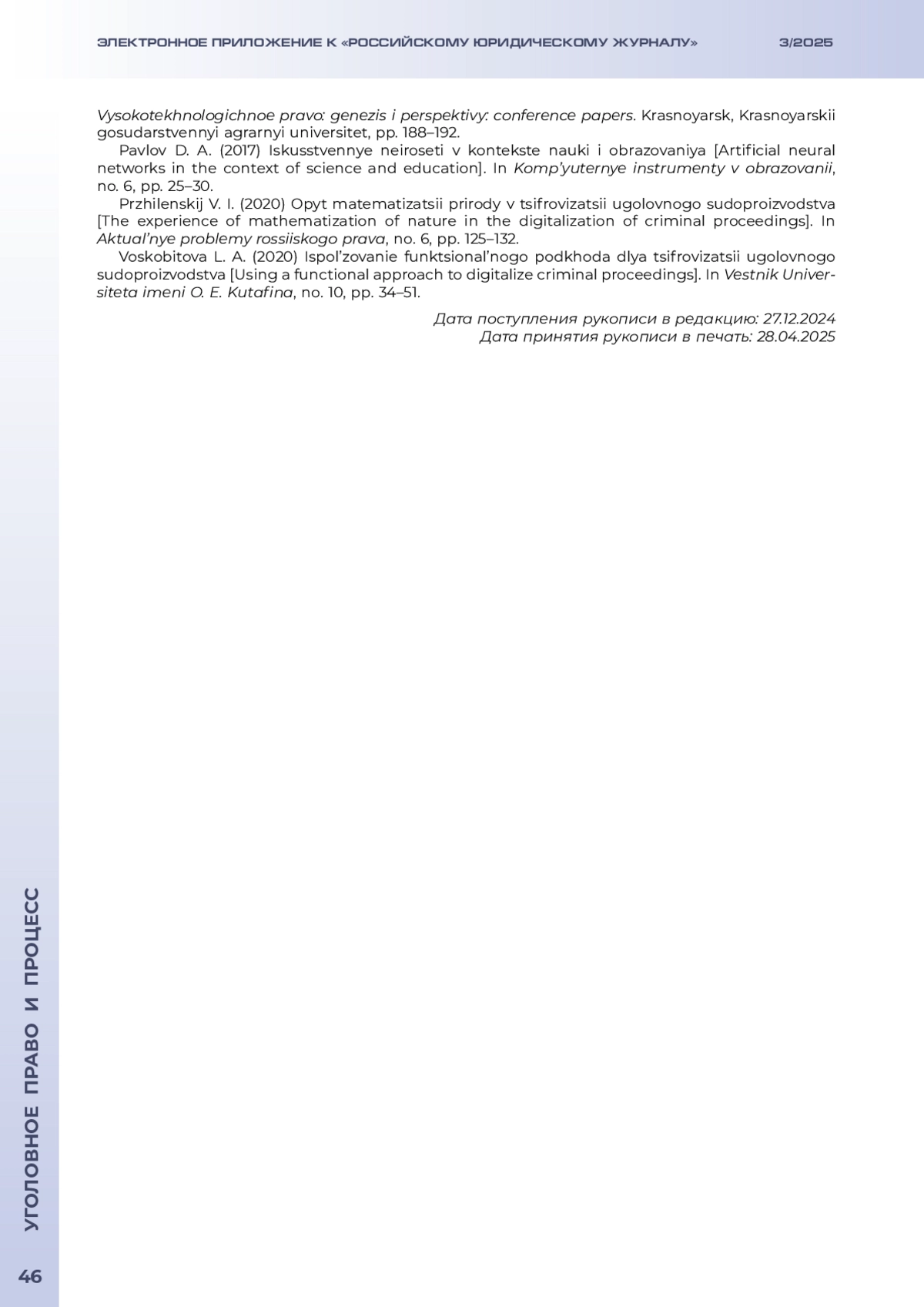 3. Воскобитова Л. А. Использование функционального подхода для цифровизации уголовного судопроизводства // Вестник Университета имени О. Е. Кутафина (МГЮА). 2020. № 10. С. 34-51. EDN: XCJNZS