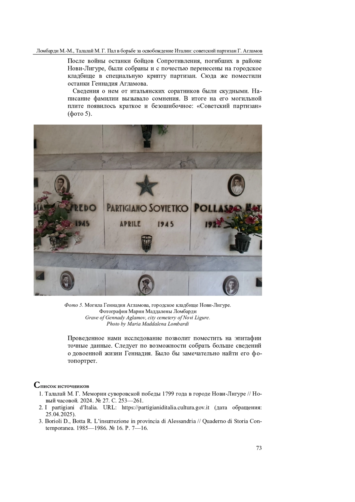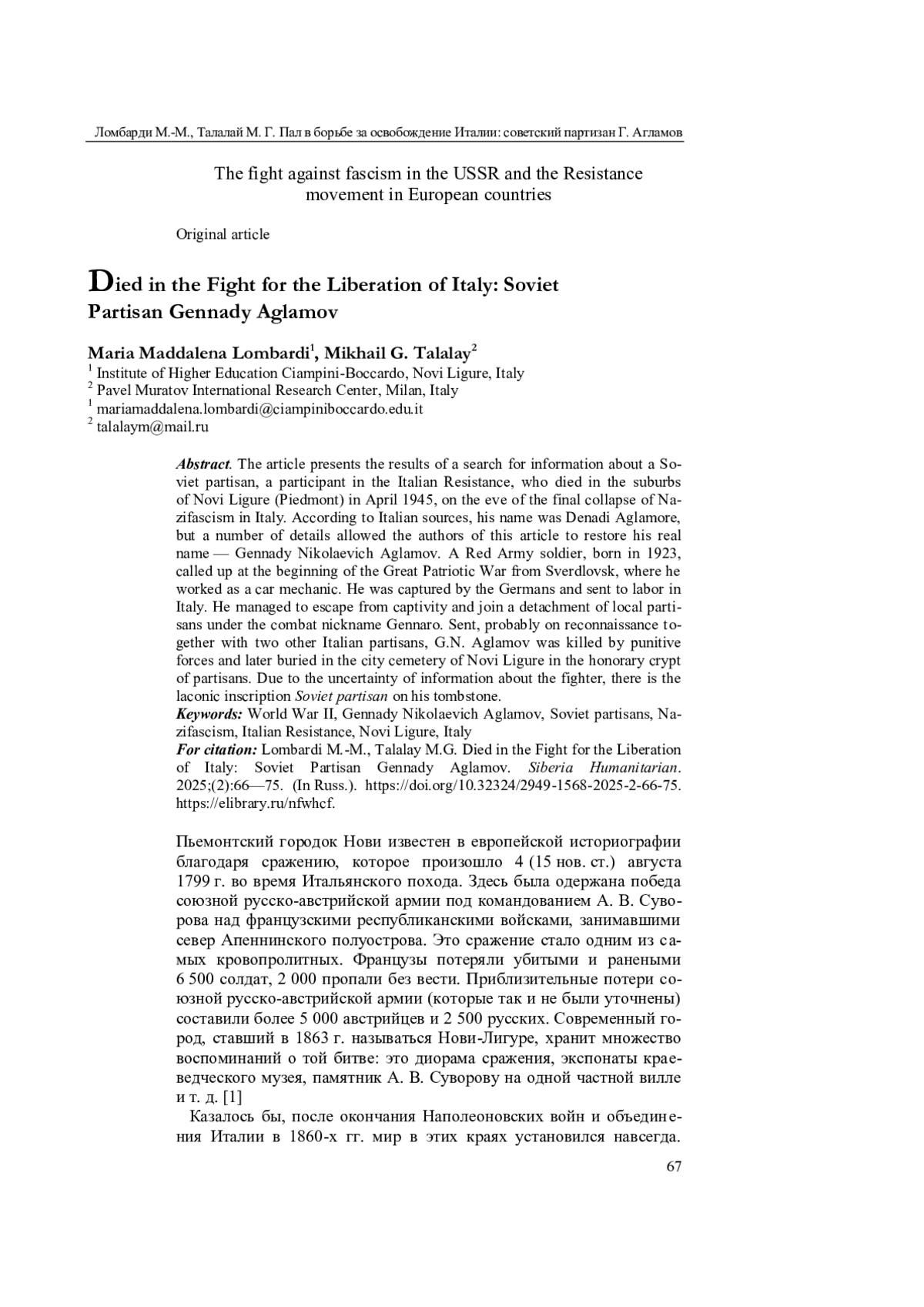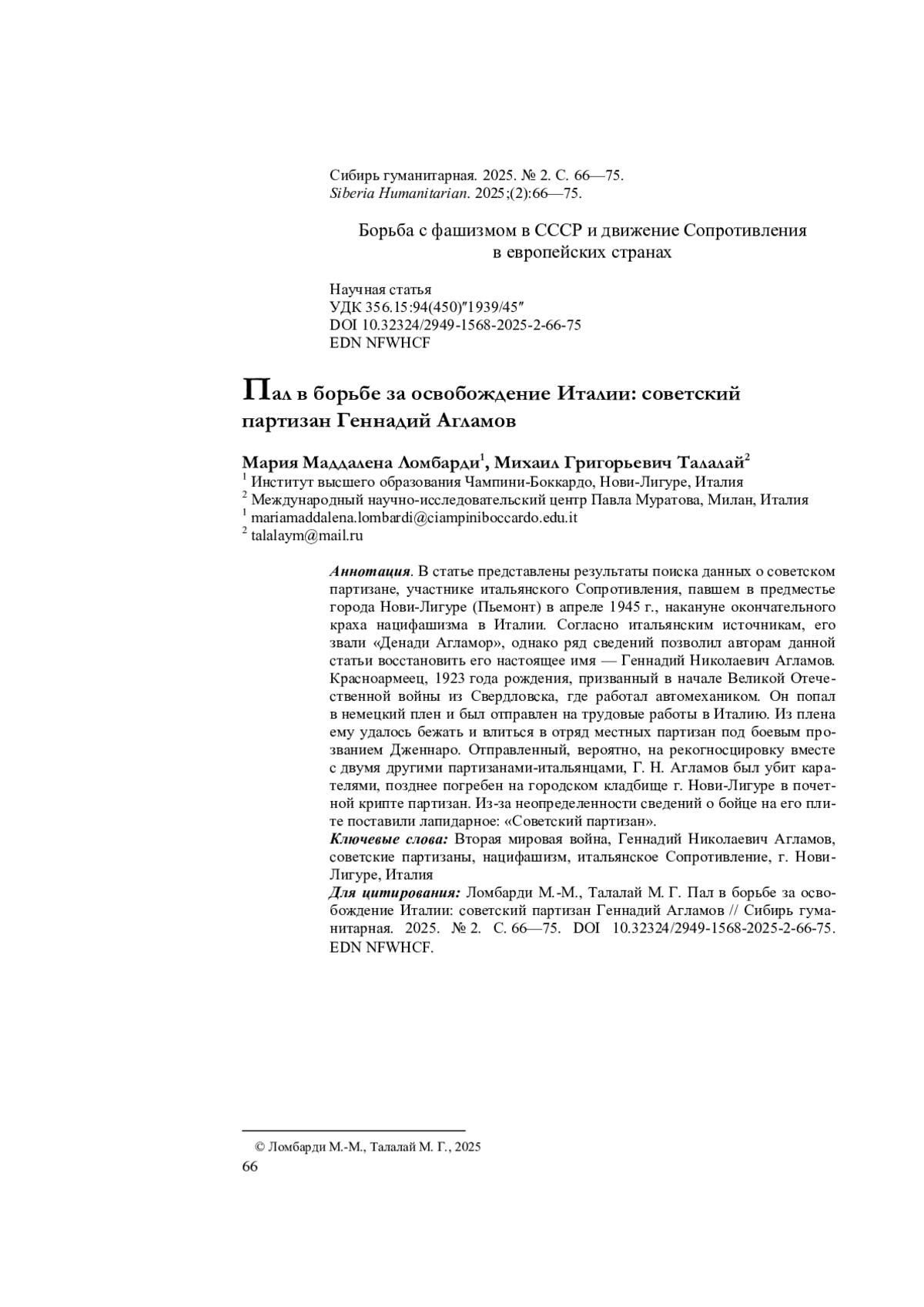 ЛОМБАРДИ М. М., ТАЛАЛАЙ М. Г. ПАЛ В БОРЬБЕ ЗА ОСВОБОЖДЕНИЕ ИТАЛИИ: СОВЕТСКИЙ ПАРТИЗАН ГЕННАДИЙ АГЛАМОВ // СИБИРЬ ГУМАНИТАРНАЯ. 2025. № 2 (10)