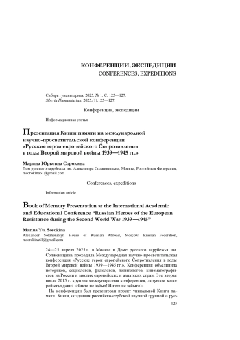 СОРОКИНА М. Ю. ПРЕЗЕНТАЦИЯ КНИГИ ПАМЯТИ НА МЕЖДУНАРОДНОЙ НАУЧНО-ПРОСВЕТИТЕЛЬСКОЙ КОНФЕРЕНЦИИ «РУССКИЕ ГЕРОИ ЕВРОПЕЙСКОГО СОПРОТИВЛЕНИЯ В ГОДЫ ВТОРОЙ МИРОВОЙ ВОЙНЫ 1939—1945 ГГ.» // СИБИРЬ ГУМАНИТАРНАЯ. 2025. № 2 (10)