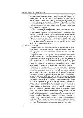 Частные архивы, личная переписка — важный исторический источник. Накануне 80-летия Великой Победы автором переосмыслены документы из семейного архива. В семье автора есть свой герой — Леонид Владимирович Изволенский, который прошел войну с 1941 по 1945 г. и за-вершил ее в звании гвардии старшего лейтенанта. Он был награжден двумя орденами Красной звезды, орденом Великой Отечественной войны II степени, медалями «За освобождение Варшавы», «За взятие Берлина», «За победу над Германией в Великой Отечественной войне 1941—1945 гг.», «За отвагу». О своих подвигах в письмах родителям он написал только однажды, и то уже в августе 1945 г. В письмах домой солдата интересовало здоровье родителей и больной сестры, их питание, жилищные условия и т. д. Жизнь в условиях войны была полной тягот и проблем как на фронте, так и в тылу. Настрой людей на поддержку и взаимовыручку дал силы одолеть фашизм, а также сохранить уже сложившиеся взаимоотношения. Письма как исторический источник открывают новые темы для исследователей Великой Отечественной, эти темы, касаются военной повседневности не только на передовой, но и в тылу, в каждом доме, в каждой семье.