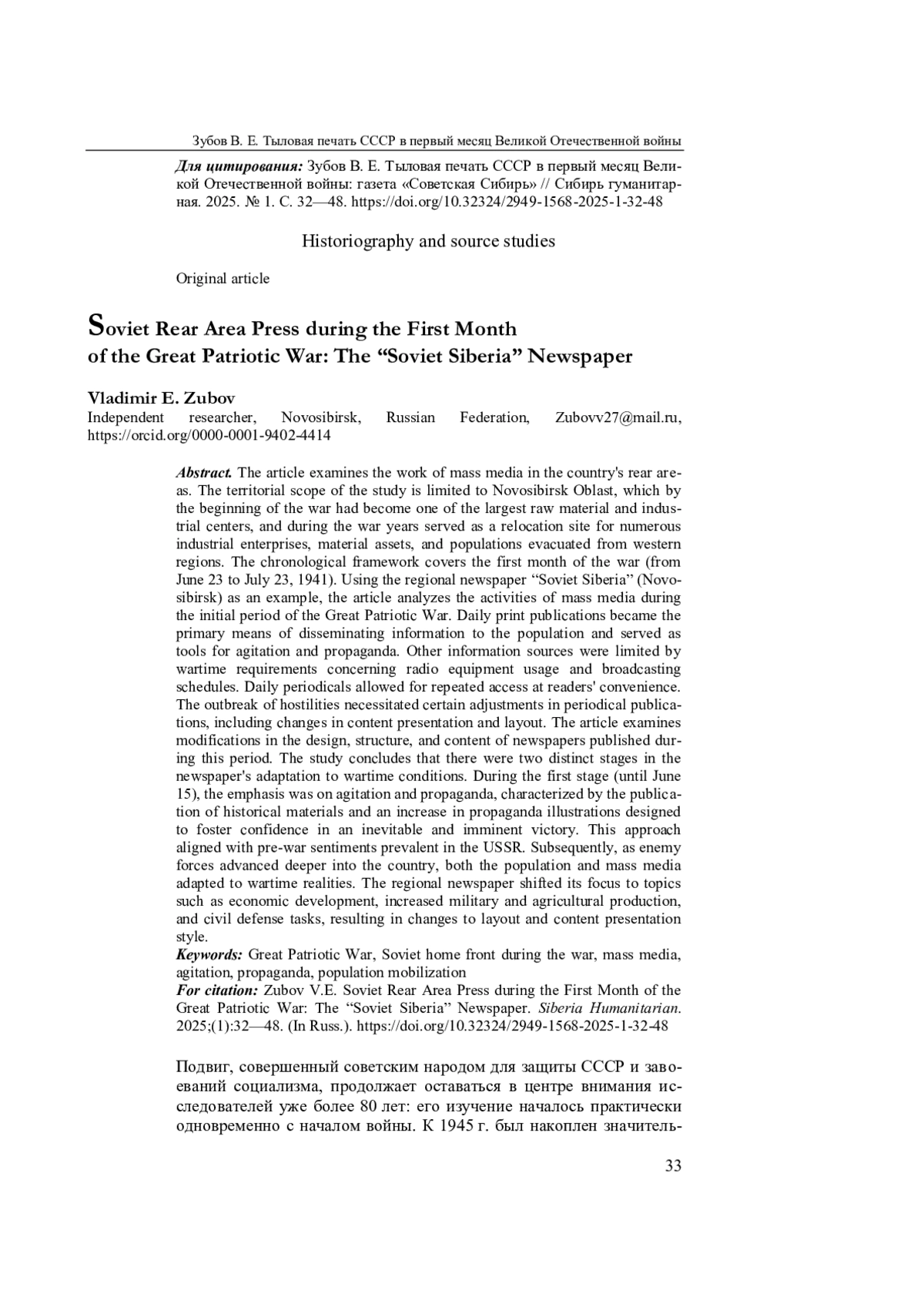 ЗУБОВ В. Е. ТЫЛОВАЯ ПЕЧАТЬ СССР В ПЕРВЫЙ МЕСЯЦ ВЕЛИКОЙ ОТЕЧЕСТВЕННОЙ ВОЙНЫ: ГАЗЕТА «СОВЕТСКАЯ СИБИРЬ» // СИБИРЬ ГУМАНИТАРНАЯ. 2025. № 1 (9)