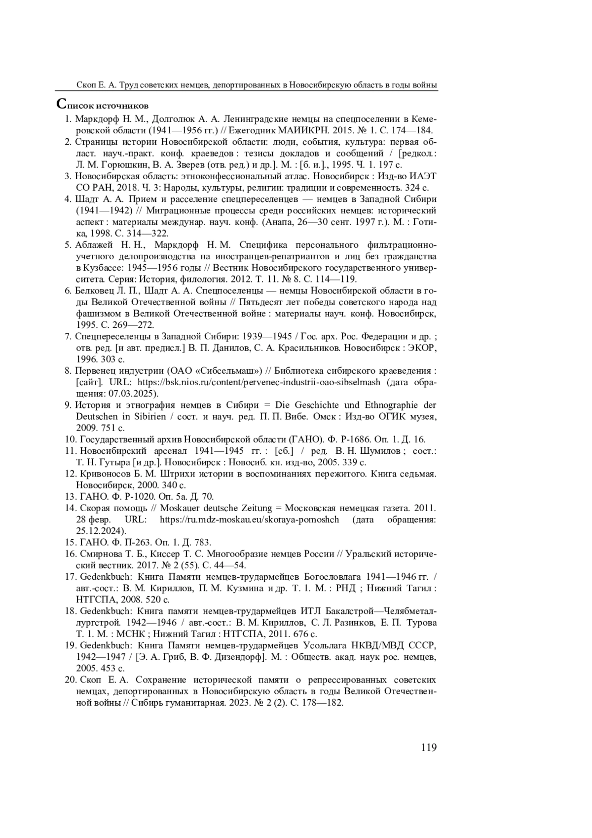 20. Скоп Е. А. Сохранение исторической памяти о репрессированных советских немцах, депортированных в Новосибирскую область в годы Великой Отечественной войны // Сибирь гуманитарная. 2023. № 2 (2). С. 178-182.