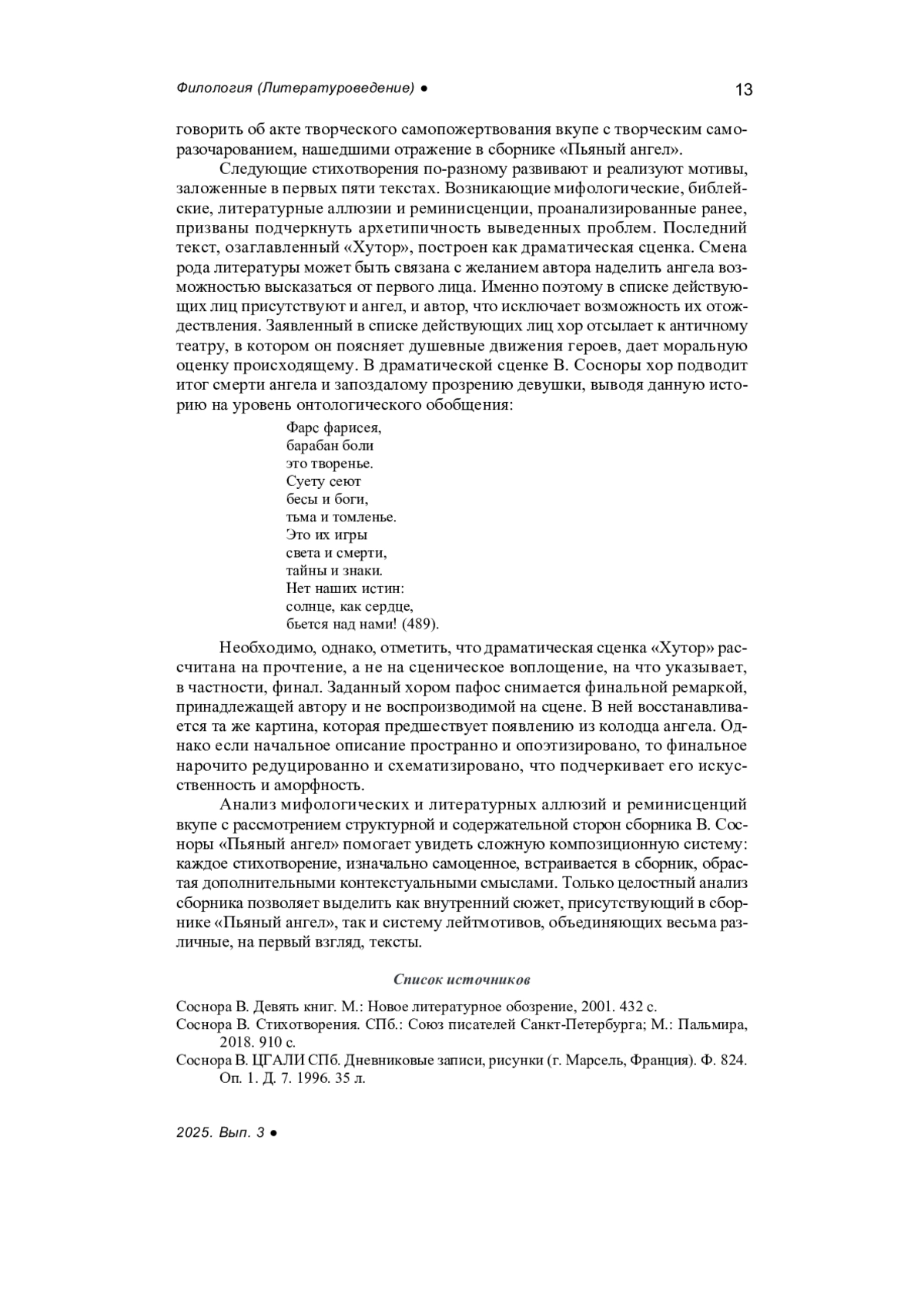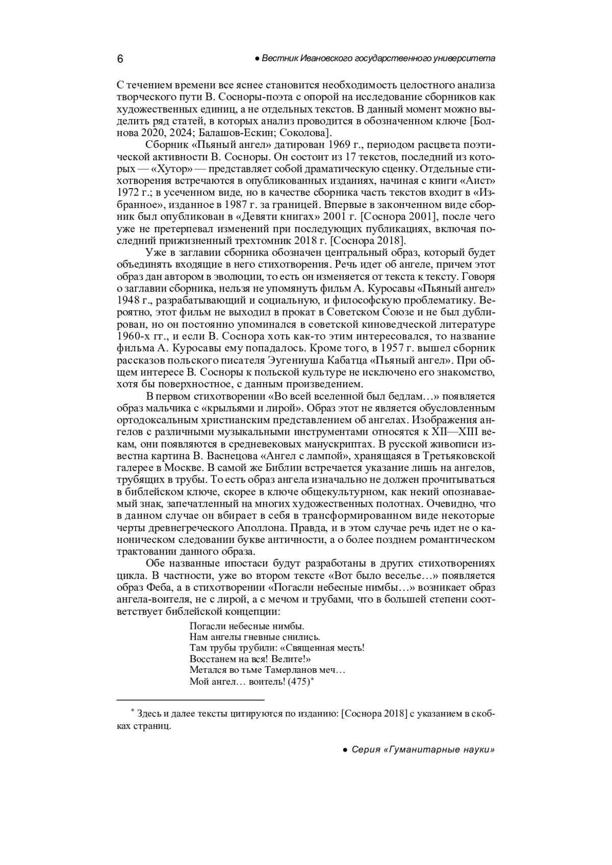 БОЛНОВА Е. В. ЛИТЕРАТУРНЫЕ И МИФОЛОГИЧЕСКИЕ ИСТОЧНИКИ ПОЭТИЧЕСКИХ ТЕКСТОВ СБОРНИКА В. СОСНОРЫ «ПЬЯНЫЙ АНГЕЛ» // ВЕСТНИК ИВАНОВСКОГО ГОСУДАРСТВЕННОГО УНИВЕРСИТЕТА. СЕРИЯ: ГУМАНИТАРНЫЕ НАУКИ. 2025. № 3
