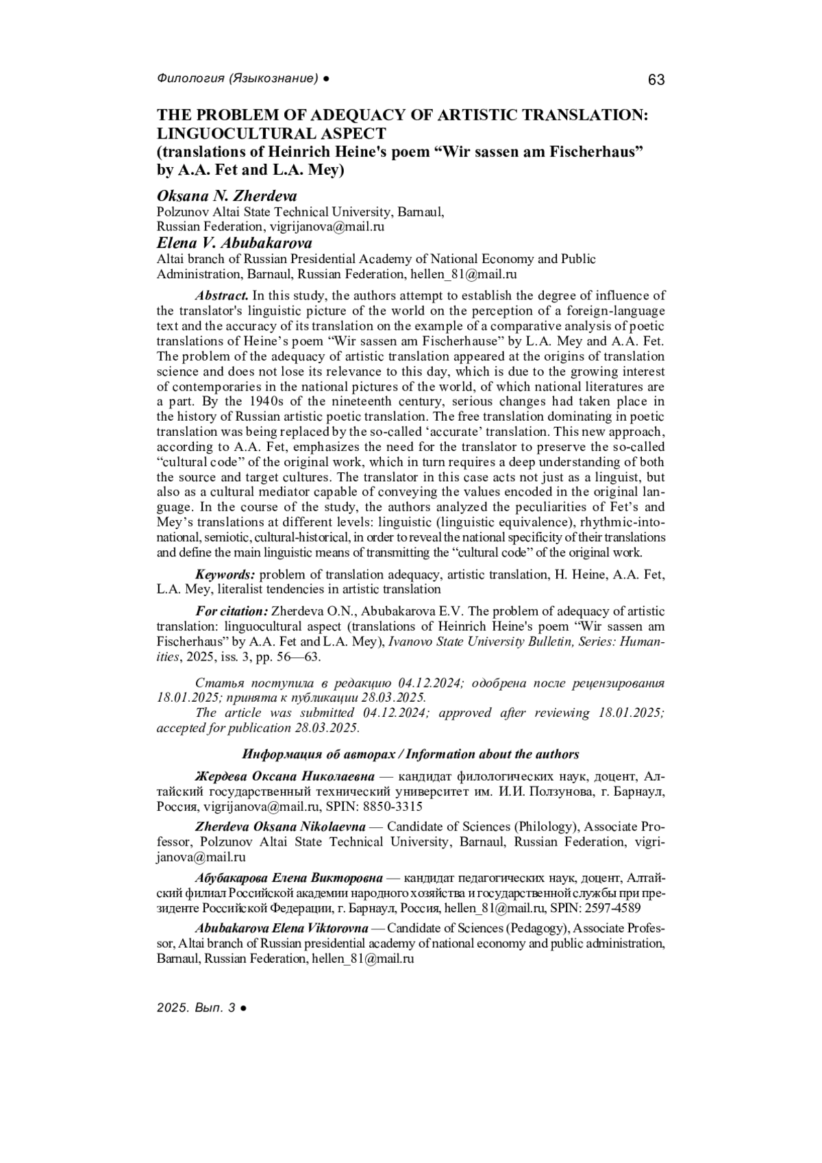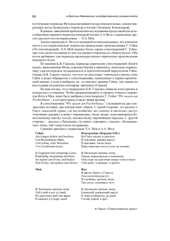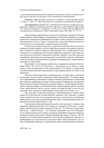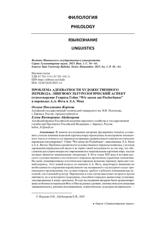 ЖЕРДЕВА О. Н., АБУБАКАРОВА Е. В. ПРОБЛЕМА АДЕКВАТНОСТИ ХУДОЖЕСТВЕННОГО ПЕРЕВОДА: ЛИНГВОКУЛЬТУРОЛОГИЧЕСКИЙ АСПЕКТ (СТИХОТВОРЕНИЕ ГЕНРИХА ГЕЙНЕ “WIR SASSEN AM FISCHERHAUSE” В ПЕРЕВОДАХ А. А. ФЕТА И Л. А. МЕЯ) // ВЕСТНИК ИВАНОВСКОГО ГОСУДАРСТВЕННОГО УНИВЕРСИТЕТА. СЕРИЯ: ГУМАНИТАРНЫЕ НАУКИ. 2025. № 3
