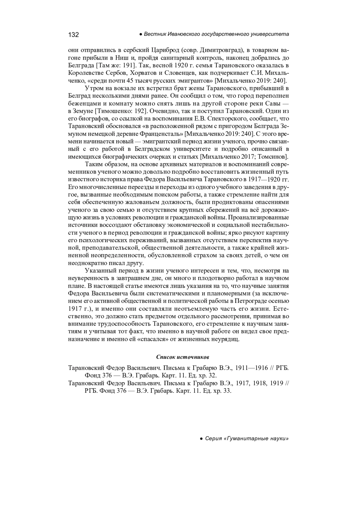 Goncharova E.A. The life and scientific activity of F.V. Taranovsky on the eve of emigration, Bulletin of the Volgograd Institute of Business. Series: “Business. Education. Law”, 2018, no. 2 (43), pp. 341-345. - In Russ.