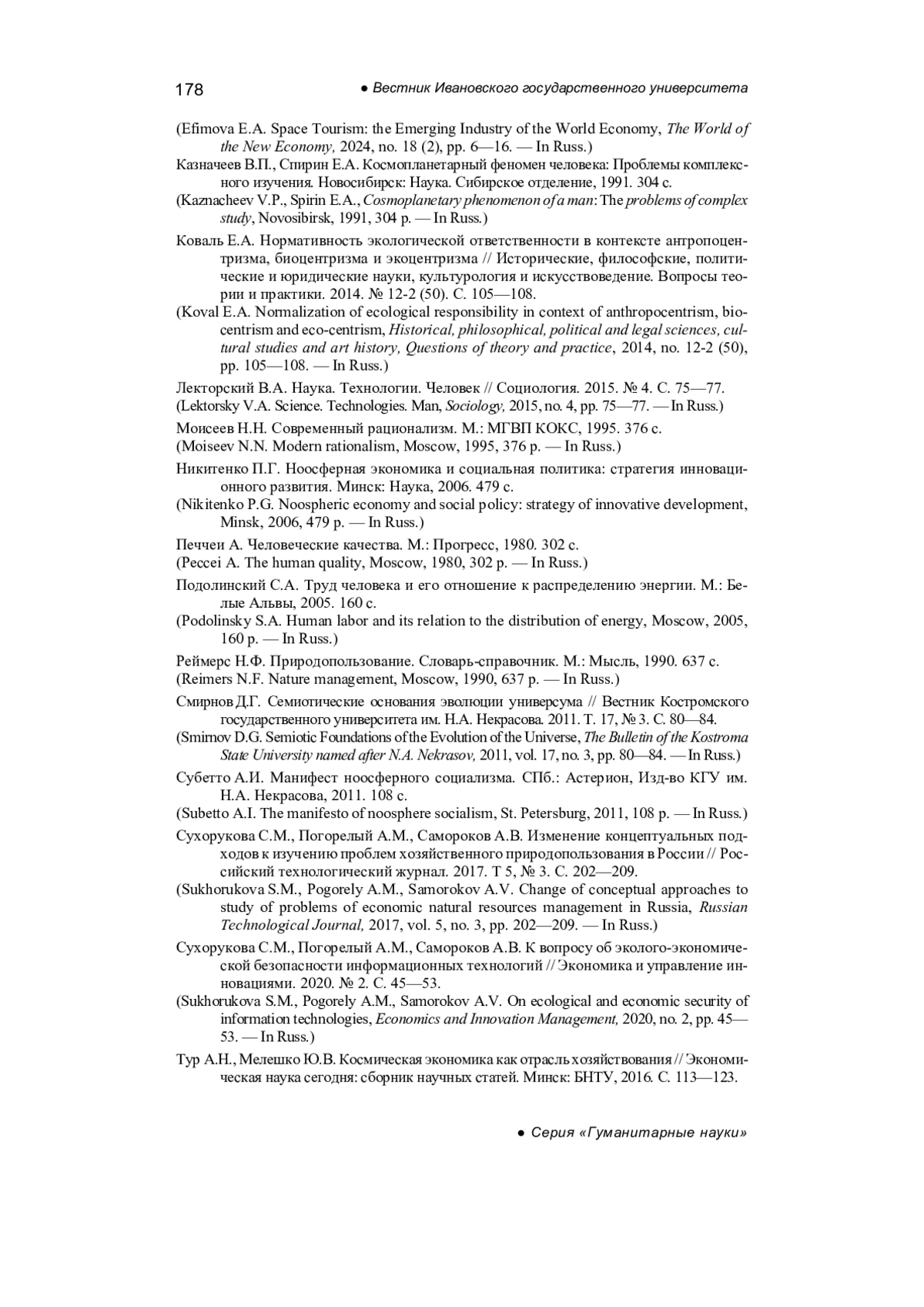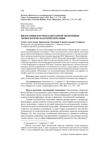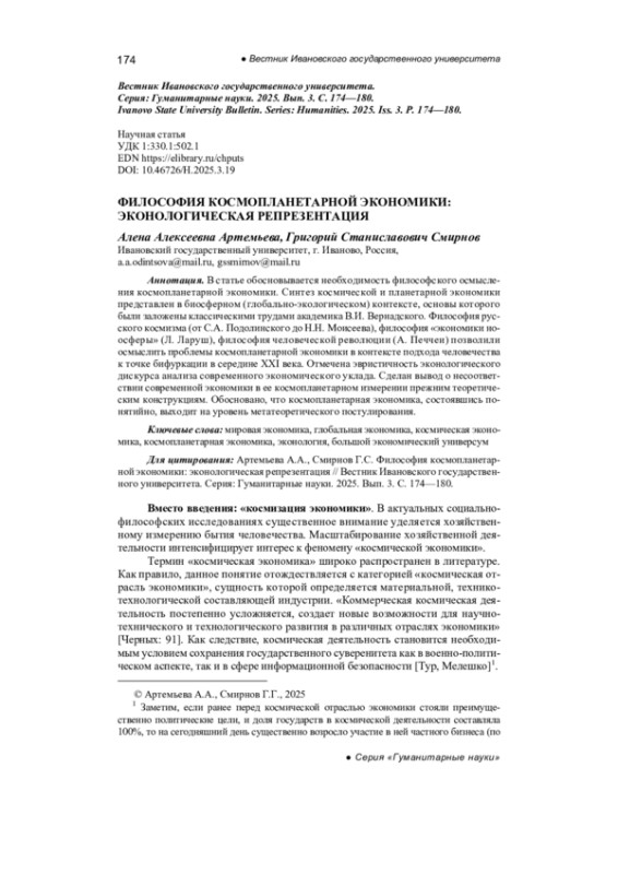 АРТЕМЬЕВА А. А., СМИРНОВ Г. С. ФИЛОСОФИЯ КОСМОПЛАНЕТАРНОЙ ЭКОНОМИКИ: ЭКОНОЛОГИЧЕСКАЯ РЕПРЕЗЕНТАЦИЯ // ВЕСТНИК ИВАНОВСКОГО ГОСУДАРСТВЕННОГО УНИВЕРСИТЕТА. СЕРИЯ: ГУМАНИТАРНЫЕ НАУКИ. 2025. № 3