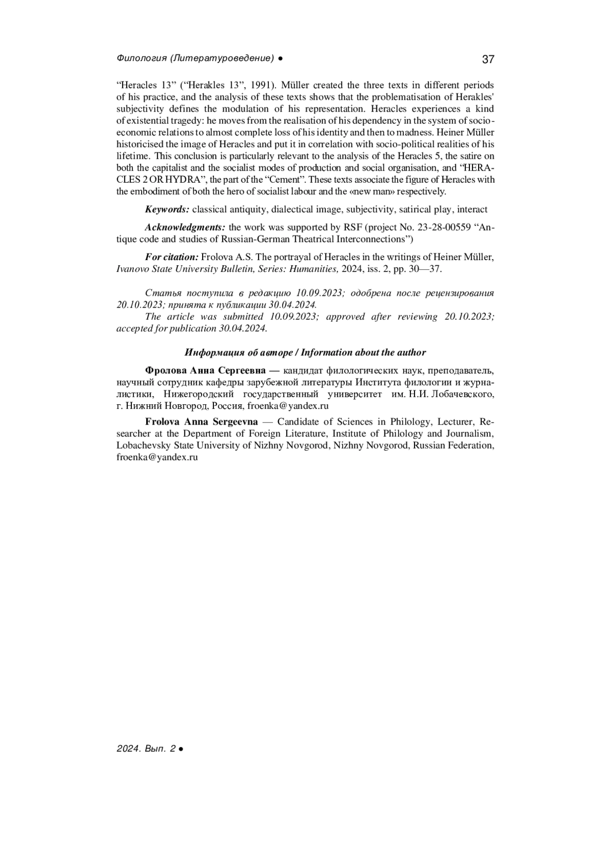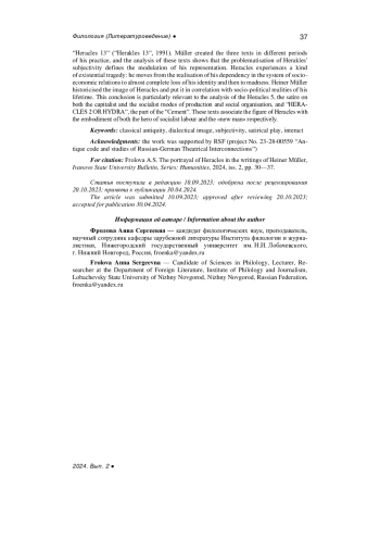 В статье впервые в отечественном литературоведении рассматривается эволюция образа Геракла в творческой практике Хайнера Мюллера: в драме «Геракл 5» (“Herakles 5”, 1964), интермедии «ГЕРАКЛ 2 ИЛИ ГИДРА» (“HERAKLES 2 ODER DIE HYDRA”, 1972) и в стихотворении «Геракл 13» (“Herakles 13”, 1991). В ходе анализа трёх текстов, значительно отдаленных друг от друга по времени создания, делается вывод о том, что определяющим вектором развития фигуры Геракла является проблематизация его собственной субъектности. Геракл переживает своего рода экзистенциальную трагедию: от осознания своего зависимого положения в системе социально-экономических отношений он движется к фактически полной потере идентичности и безумию как последней стадии. В заключение отмечается, что фигура Геракла историзируется Хайнером Мюллером и рассматриваются в современных драматургу социально-политических реалиях. Это особенно актуально для пьесы «Геракл 5», представляющей собой сатиру как на капиталистическую, так и на социалистическую модель общественного устройства, и интермедии «ГЕРАКЛ 2 ИЛИ ГИДРА», являющейся составной частью драмы «Цемент». В этих текстах фигура Геракла связана с воплощением образа героя социалистического труда и «нового человека» соответственно